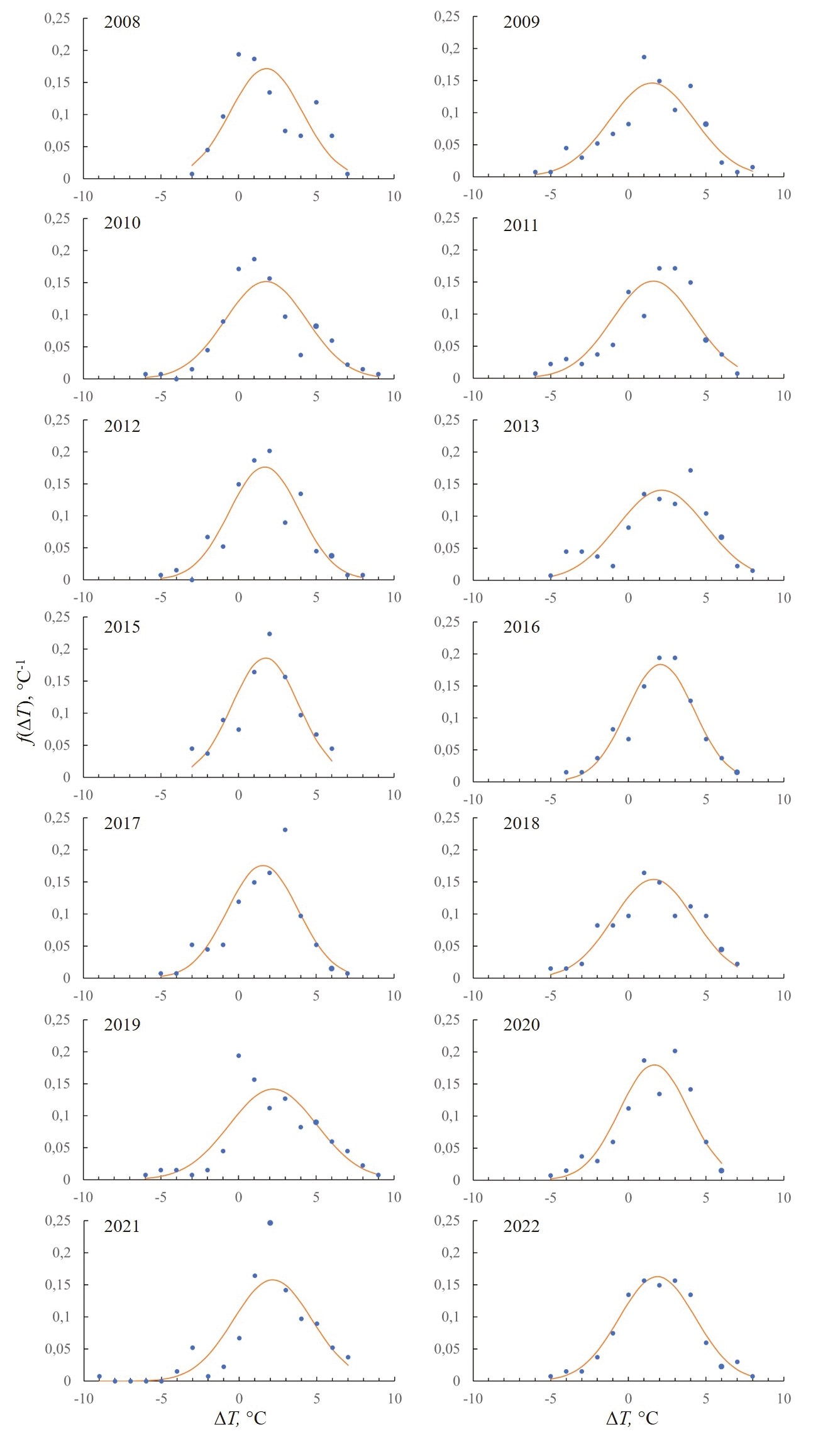 Для детального анализа параметра ∆T для каждого года построена соответствующая функция плотности распределения f(∆T) (рис. 7) и рассчитаны ее основные характеристики. Для некоторых лет распределение оказалось весьма близким к Гауссову, в остальных случаях для функций распределения характерны отрицательные значения коэффициента асимметрии