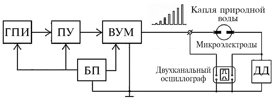 Схема включает следующие элементы: генератор прямоугольного импульса (ГПИ), предварительный усилитель (ПУ), высоковольтный усилитель мощности (ВУМ) с пошаговым усилением, микроэлектроды, декадный делитель (ДД) из прецизионных резисторов, двухканальный осциллограф и стабилизированный блок питания (БП). Чувствительность кондуктометра составляет ~0.7×10–6 М или ~3 г NaCl на 60 т деионизованной воды.