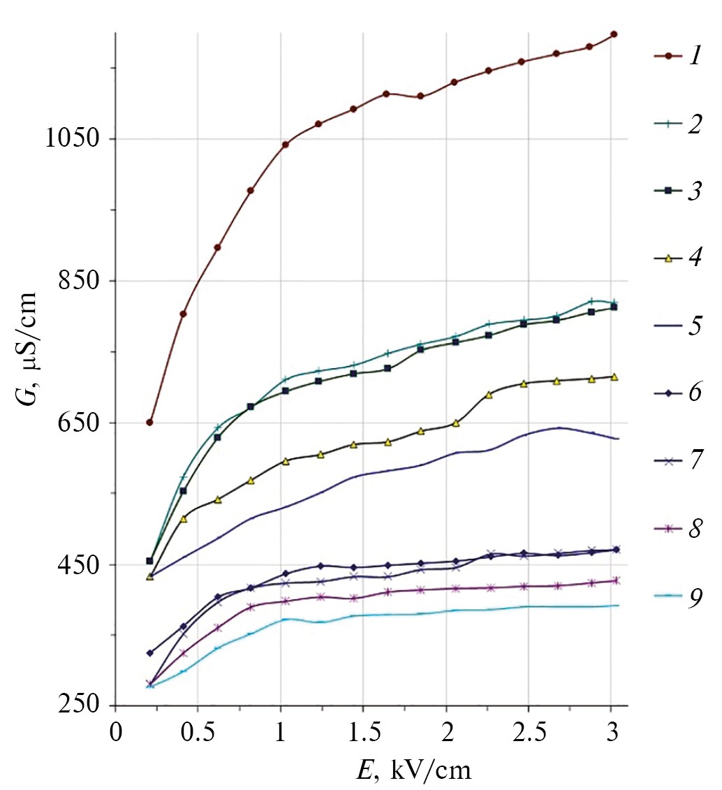 Исследования проводимости природной воды выполнены в ИЭПВН методом и аппаратурой кондуктометрии с погрешностью ≤3.5% в диапазоне 0...3 кВ/см [17]. Все измерения проводимости образцов воды выполнены при температуре +25±0.5°С. Для этого использован термостабилизированный столик, а температурная погрешность измеренной проводимости была ≤2% [13]. Учитывая то, что температурная зависимость проводимости разбавленных водных растворов незначительна и линейна (в данном диапазоне) [1, 2, 13], ее влиянием на нелинейные процессы в ИЭПВН можно пренебречь.