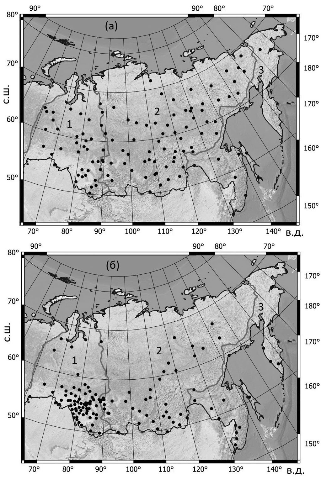 Рис. 1. Расположение метеорологических станций (точки) на азиатской части России, данные маршрутных снегомерных съемок которых использованы в работе для лесных (а) и полевых (б) участков. Серые линии показывают границы, разделяющие Западную Сибирь (1), Восточную Сибирь (2) и Дальний Восток (3)
