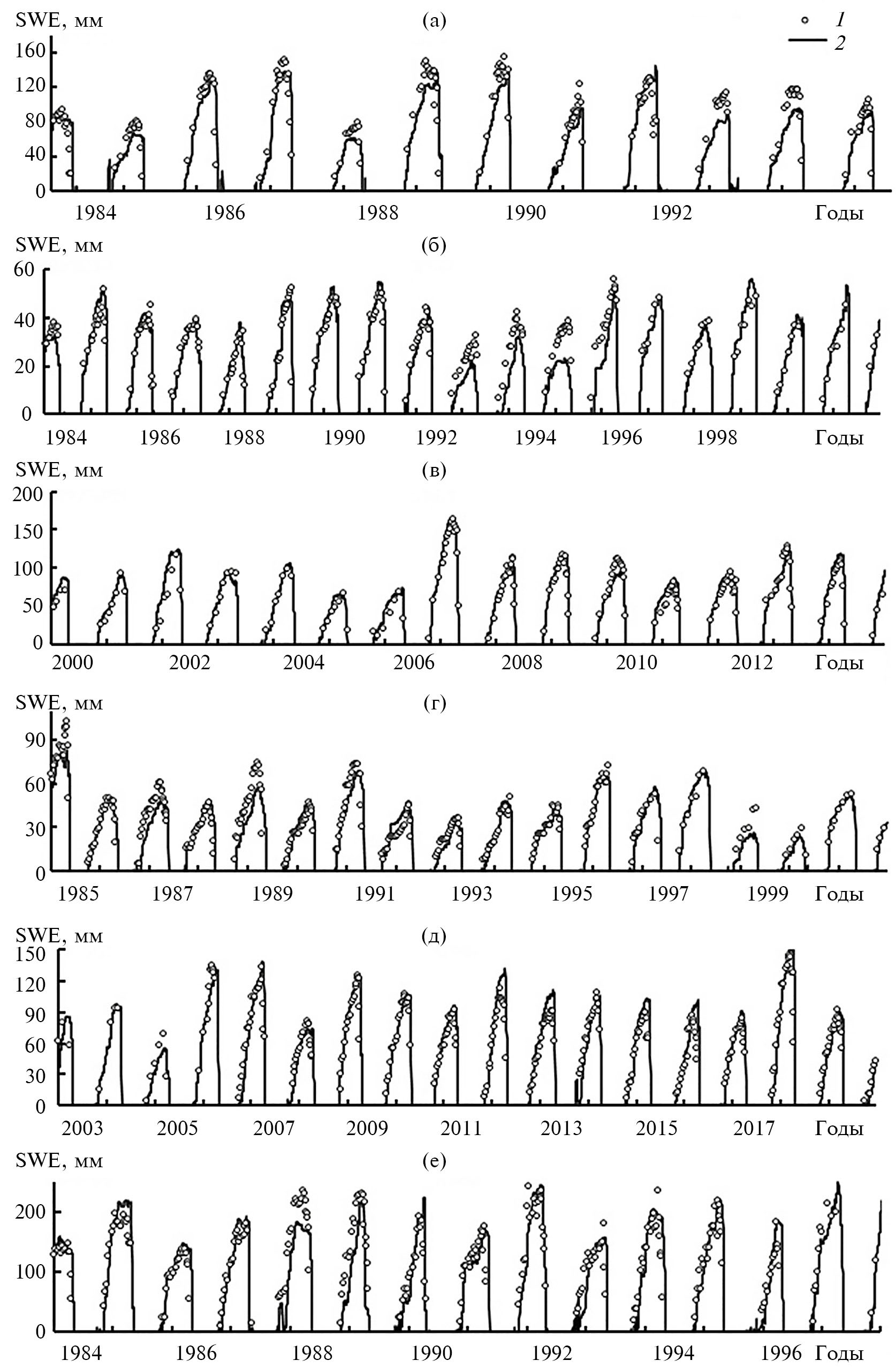 Рис. 2. Примеры сопоставления измеренных (1) и рассчитанных на основе модели SWAP (2) снегозапасов в районах лесных (а–в) и полевых (г–е) маршрутных снегосъемок на станциях Тюмень (а), Верхоянск (б), Ванавара (в), Оймякон (г), Орлинга (д), Соболево (е)