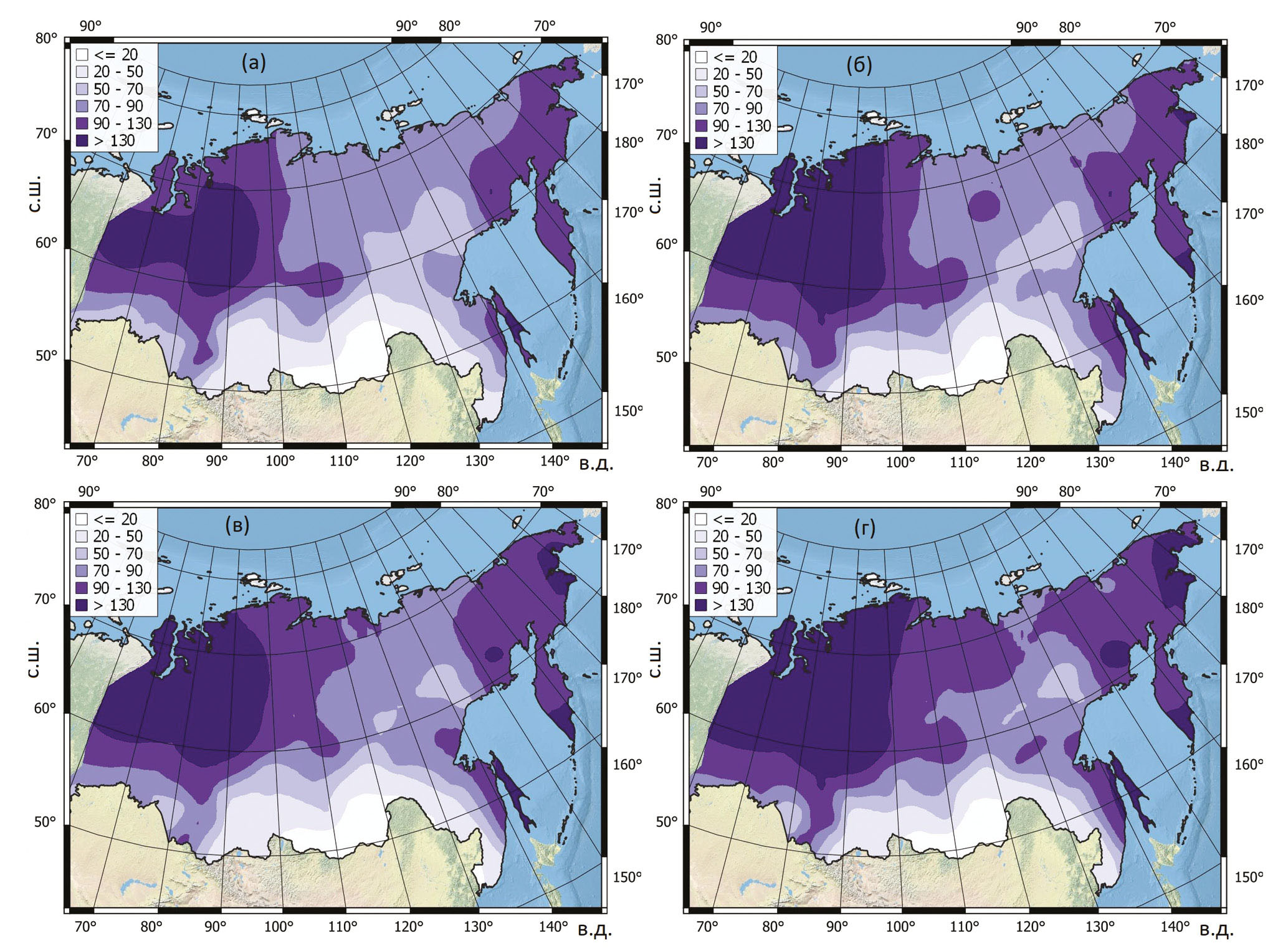 Кроме того, отметим, что картирование полученных значений климатических характеристик формирования снежного покрова в силу небольшого числа расчетных точек (138 для каждого типа подстилающей поверхности) и вышеуказанных особенностей их распределения довольно грубовато и не отражает обусловленных в основном рельефом особенностей пространственного распределения указанных характеристик, как это, например, сделано в [10] при оценке климатических значений SWE для ЗС для февраля за период 1979–2013 гг. Возможность получить более детальную картину пространственного распределения соответствующей характеристики определяется бóльшим количеством и более равномерным распределением расчетных точек, плотность которых в [10] более чем на порядок больше, чем в настоящей работе, в связи с использованием модельных метеорологических данных для пространственной расчетной сетки 0.75° × 0.75°.