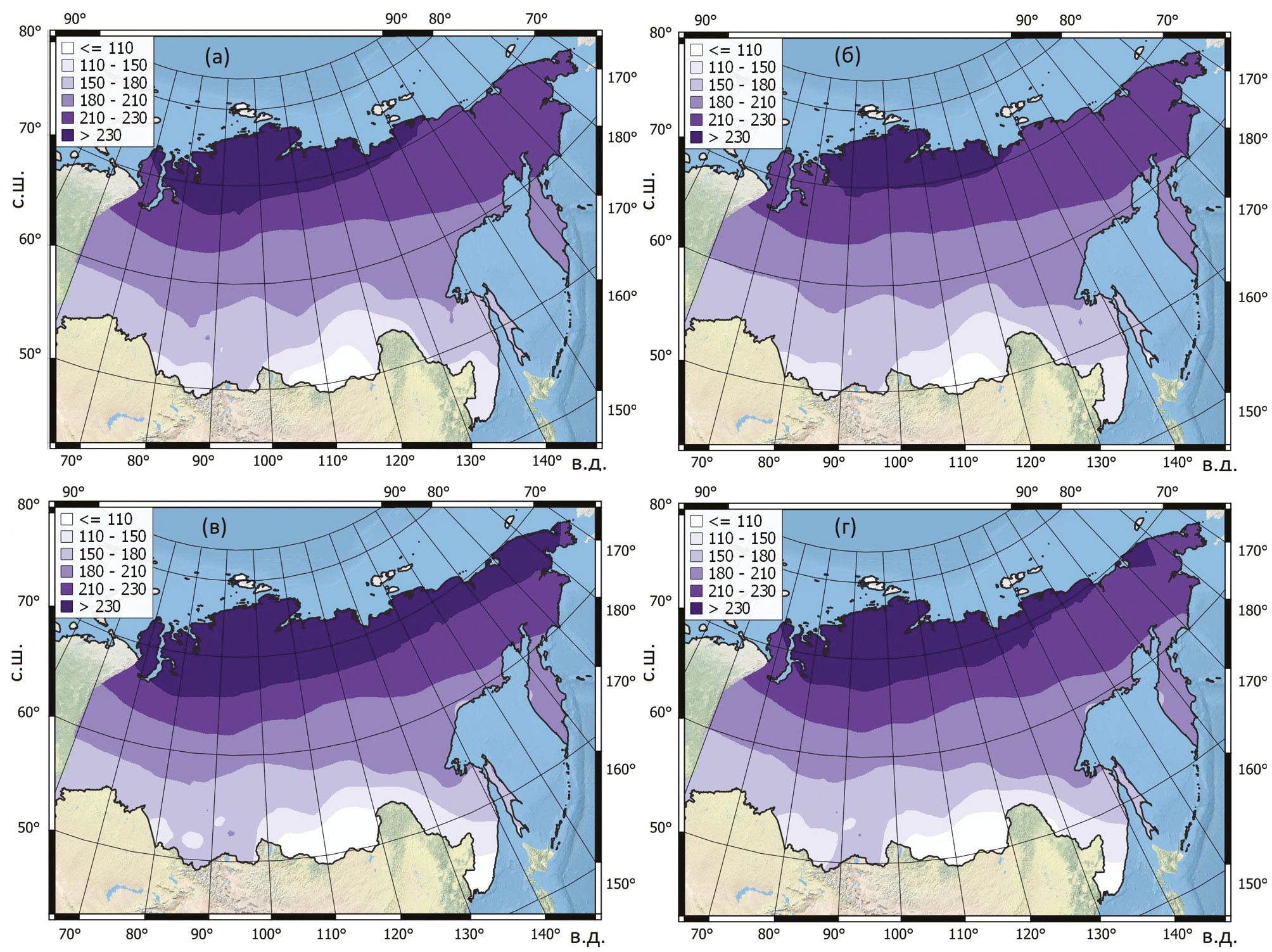 Рис. 4. Распределение климатических значений продолжительности залегания снежного покрова (сут) на полевых (а, б) и лесных (в, г) участках АТР для периодов Т1 (а, в) и Т2 (б, г)