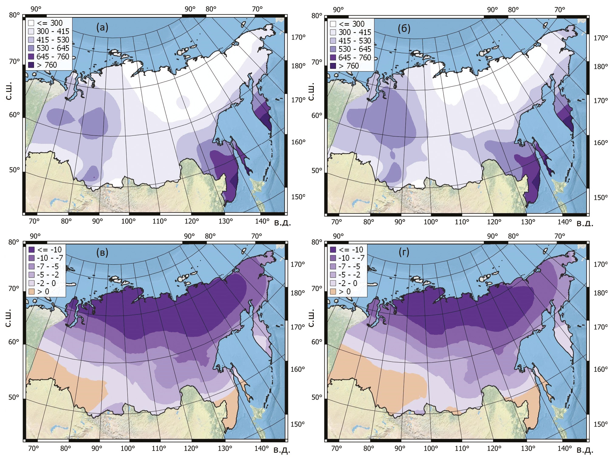 Рис. 5. Распределение климатических значений годовых сумм осадков (мм/год) (а, б) и среднегодовой приземной температуры воздуха (°С) (в, г) по АТР для периодов Т1 (а, в) и Т2 (б, г)