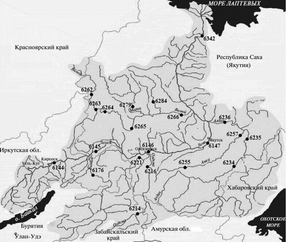 Вилюй | 6262 – Усть-Амбардаах; 6263 – Чернышевский; 6264 – Сюльдюкар; 6265 – Сунтар; 6266 – Хатырык-Хомо; 6279 – Чумпурук (р. Марха); 6284 – Угуляцы (р. Тюнг) |