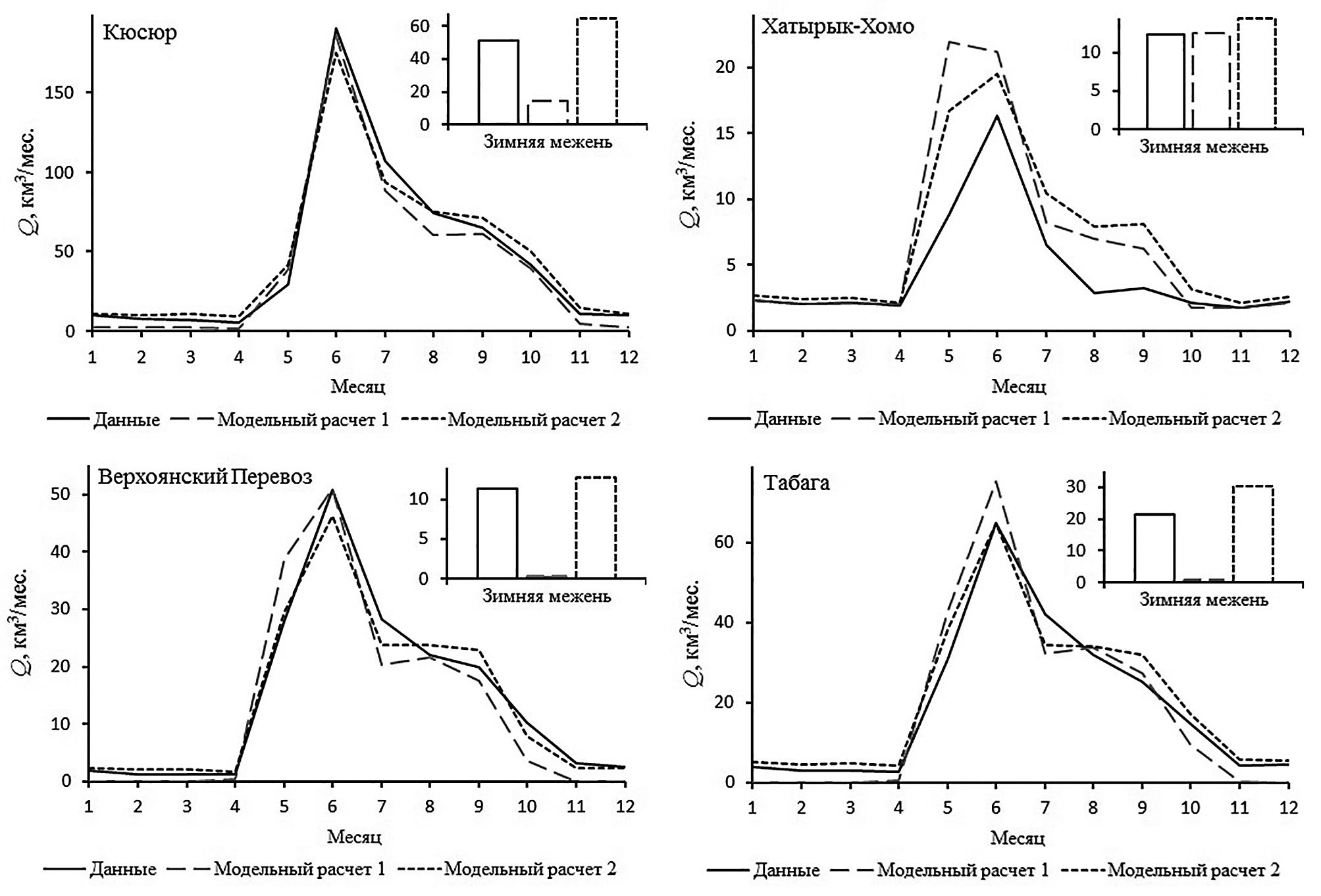 Рис. 3. Сравнение среднемесячных расходов для двух модельных расчетов с данными наблюдений на г/п Кюсюр (за период с 1980 по 2011 г.), на стоковых станциях Хатырык-Хомо (с 1980 по 2005 г.), Верхоянский Перевоз и Табага (с 1980 по 1999 г.)