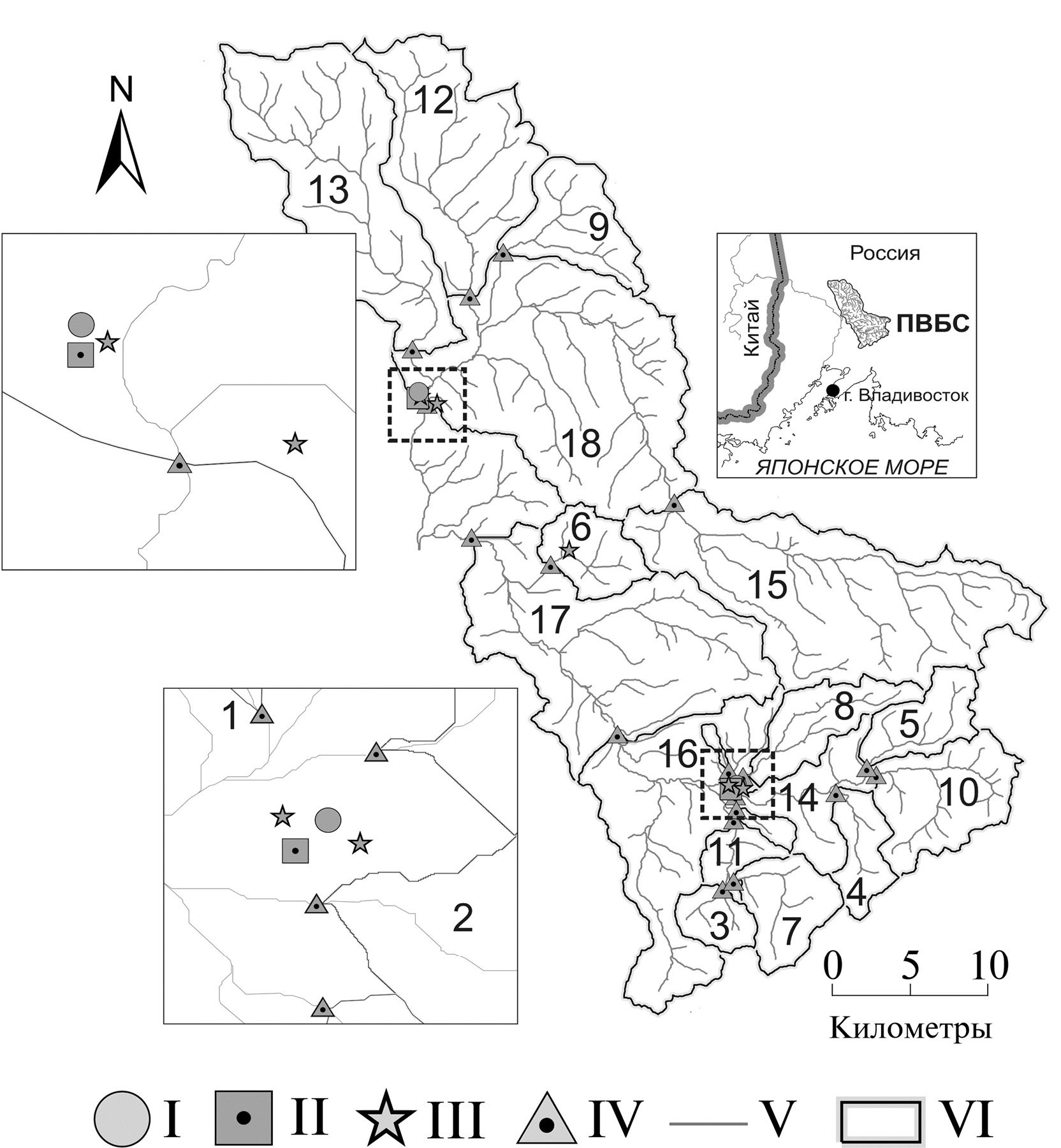 Объектами исследования были 18 водосборов площадью от 2.4 до 755 км2, расположенных в пределах бывшей ПВБС, функционировавшей с начала 1950-х по конец 1980-х гг. Территория относится к водосборам рек Комаровки и ее главному притоку, Раковке (общая площадь водосбора ~ 1450 км2, рис. 1), которые берут свое начало на склонах хребта Пржевальского в Уссурийском и Михайловском районах Приморского края. Рельеф юго-восточной части ПВБС, к которой относятся верховья рек Комаровки и Раковки, в основном представляет собой среднегорье, уклоны склонов находятся в диапазоне 15–35°, абсолютные высоты в среднем составляют 300–500 м, на приводораздельных участках достигают 700 м. Верховья Комаровки и частично Раковки покрыты хвойно-широколиственным лесом, в долинах распространены пойменные широколиственные леса, в нижних частях – редкие дубовые леса. В почвенном покрове преобладают горные бурые лесные почвы. Северо-западная часть ПВБС, к которой относится правобережье р. Раковки, характеризуется холмисто-увалистым рельефом. Абсолютные отметки высот составляют 100–250 м, уклоны <10°. Почвенный покров представлен буро-подзолистыми и нескольких видов лугово-бурыми и луговыми глеевыми почвами, на которых произрастают разреженные дубовые леса [2].