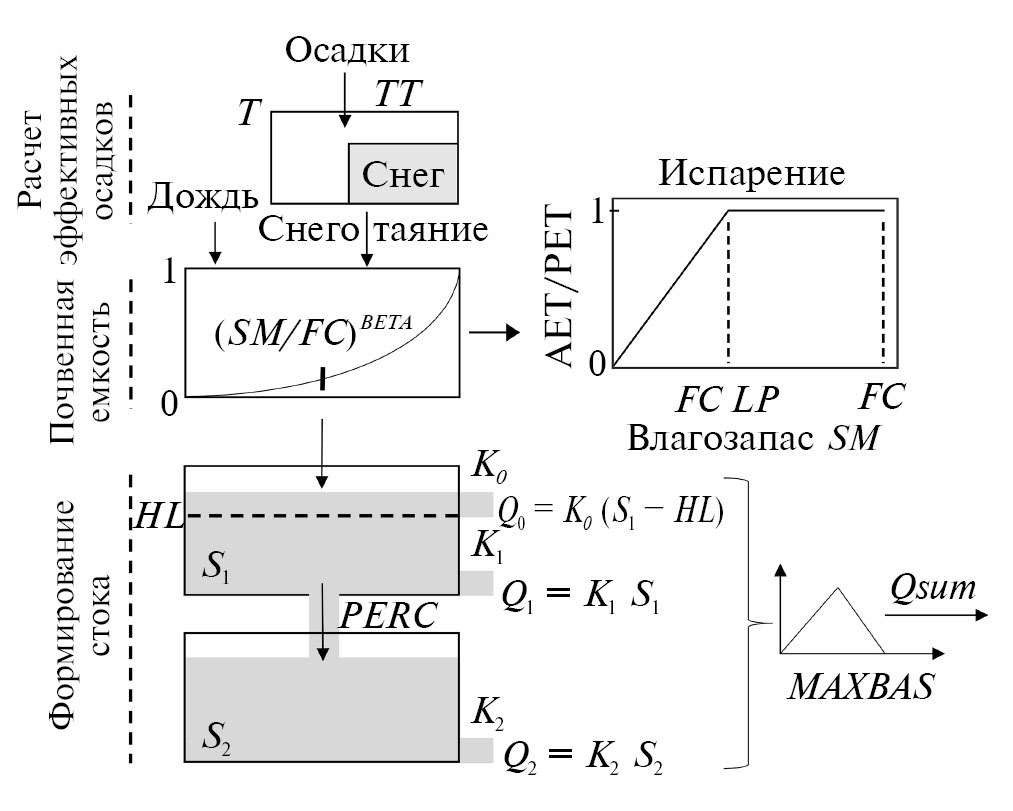 где P – осадки, мм; AET – испарение, мм; Q – речной сток, мм; SP – влагозапас снежного покрова, мм; SM – влагозапас концептуальной почвенной емкости; UZ и LZ – влагозапасы верхней и нижней стокоформирующих емкостей соответственно. Входные данные в модель – атмосферные осадки, температура воздуха и потенциальная эвапотранспирация.