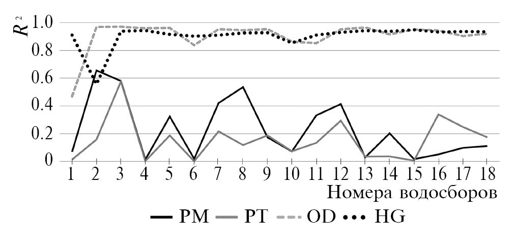 Таблица 2. Критерии соответствия расчетных значений PET, полученных методами Пенмана–Монтейса (PT), Пристли–Тэйлора (PT), Одина (OD) и Харгривза (HG) с результатами расчетов по методу Будыко и данными водных испарителей ПВБС