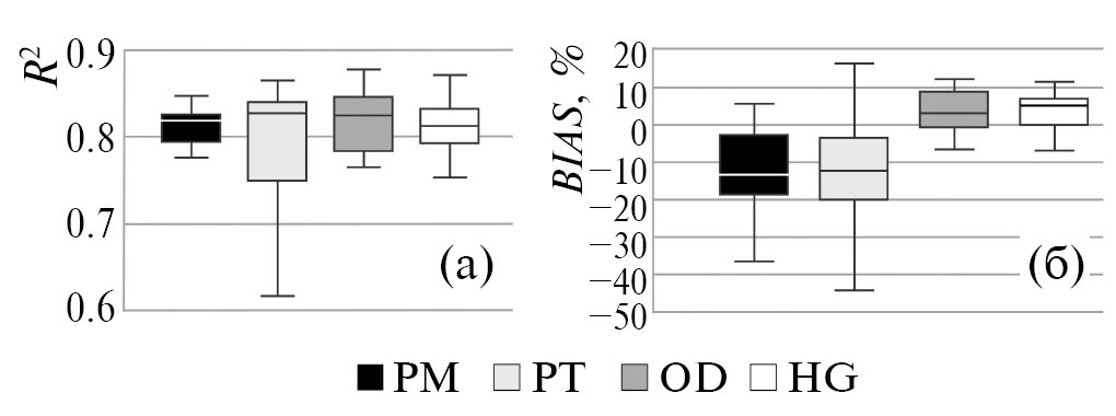 В соответствии с указанной градацией эффективности результаты моделирования стока с применением всех методов PET по критерию NSE (табл. 3) относятся к категории “удовлетворительно” или лучше, при этом большее количество случаев попадания в категорию “очень хорошо” относится к методам OD (17 случаев) и HG (16 случаев). По критерию BIAS расчеты с применением методов OD и HG “хорошие” и “очень хорошие”; применение методов PM и PT приводит к двум и трем неудовлетворительным результатам соответственно.