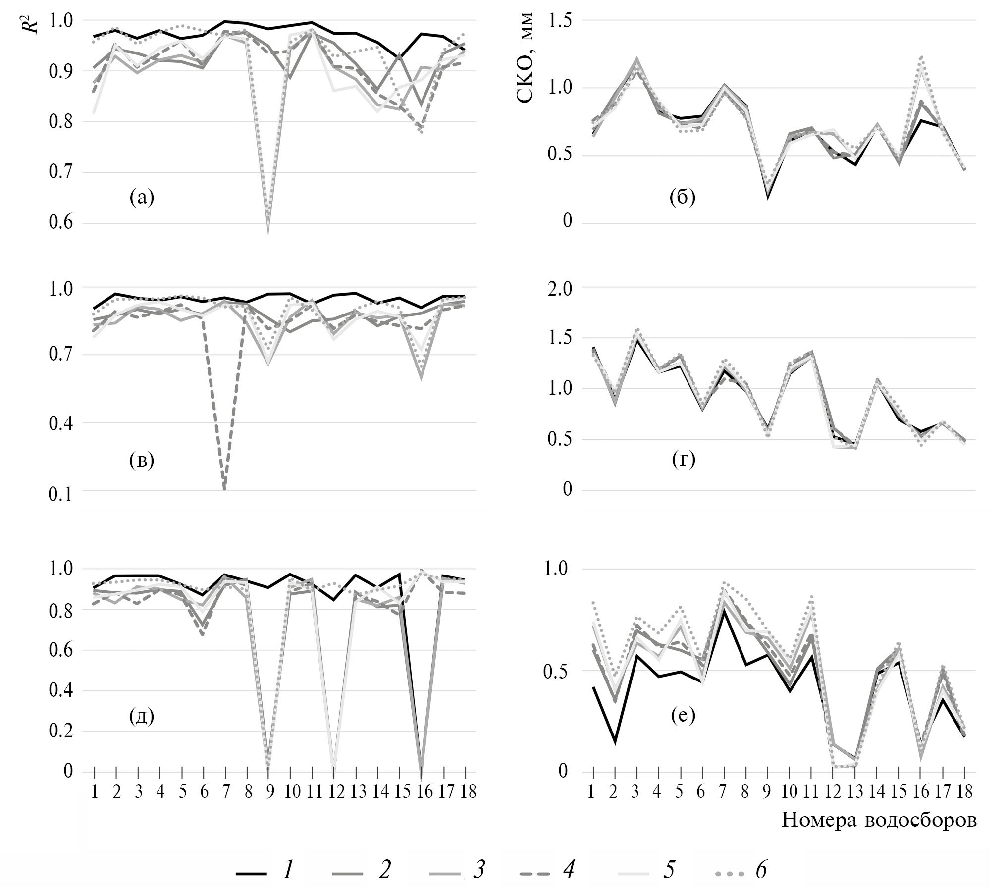 Рис. 8. Коэффициент детерминации R2 и среднеквадратическое отклонение (СКО), рассчитанные между парами различных методов определения PET для различных компонентов речного стока Q0 (а, б), Q1 (в, г), Q2 (д, е): 1 – HG/OD, 2 – HG/PM, 3 – HG/PT, 4 – OD/PM, 5 – OD/PT, 6 – PM/PT. Номера водосборов соответствуют нумерации (табл. 1)
