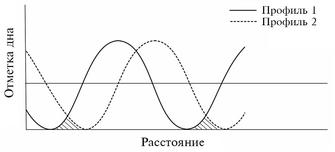 Этот метод [21] разработан, чтобы избежать необходимости работы с отдельными грядами и их характеристиками. Основное преимущество метода заключается в том, что он может быть применен к участкам дна, где часть гряд не может быть четко идентифицирована. На совмещенных эхограммах авторы выделяют области размыва, аккумуляции и области, испытывающие за время между съемками и размыв, и аккумуляцию (рис. 1). Предлагается разбить продольники на малые участки с одинаковой дискретностью и рассчитывать объем переместившихся наносов на каждом шаге. При этом объем наносов в каждой точке на поверхности гряды принимается разным. В точке пересечения эхограмм вблизи гребня гряды он принимается наибольшим и равным величине эрозии на напорном склоне гряды и одновременно величине аккумуляции на тыловом склоне этой гряды, произошедших за время между съемками. В точке выше по течению он принимается меньшим на величину объема эрозии между нею и первой точкой и т. д. В точке ниже по течению он также принимается меньшим на величину объема аккумуляции между нею и первой точкой и т. д. В областях, в которых зона аккумуляции выше по течению перекрывается зоной эрозии ниже по течению, объем наносов в каждой точке принимается равным сумме оставшегося объема аккумуляции ниже по течению и доли объема эрозии выше по течению от этой точки. Итоговый РДН рассчитывается как среднее арифметическое частных объемов переместившихся наносов, деленное на время между съемками. Согласно авторам, этот метод дает результаты, сопоставимые с их вторым методом [21]. Тем не менее представляется, что дискретизация транспорта наносов при их структурном движении, не учитывающая целостность донных форм, не отвечает физической сути процесса, поэтому этот метод кажется ошибочным.