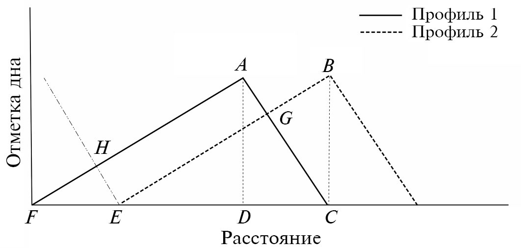 В работе Д. Гаумана и Р.Б. Якобсона [21] предлагаются три более сложных метода обработки эхограмм. В первом методе характеристики гряд определяются по конкретным грядам визуально. Для каждой гряды рассчитывается РДН по формуле (2), α = 0.6. При этом высота гряды рассчитывается за время первого и второго измерения как разность между отметкой гребня гряды и средним арифметическим отметок верхнего и нижнего подвалий. Итоговая высота гряды определяется как среднее арифметическое за два срока измерений. Скорость гряды определяется как отношение сдвига гряды ко времени между съемками. Величина сдвига гряды определяется как среднее между величинами сдвига ее нижнего подвалья, пика и верхнего подвалья. РДН определяется как среднее взвешенное из расходов, рассчитанных по формуле (2) для каждой отдельной гряды, где вес гряды принимается равным ее доле в общей длине профиля.