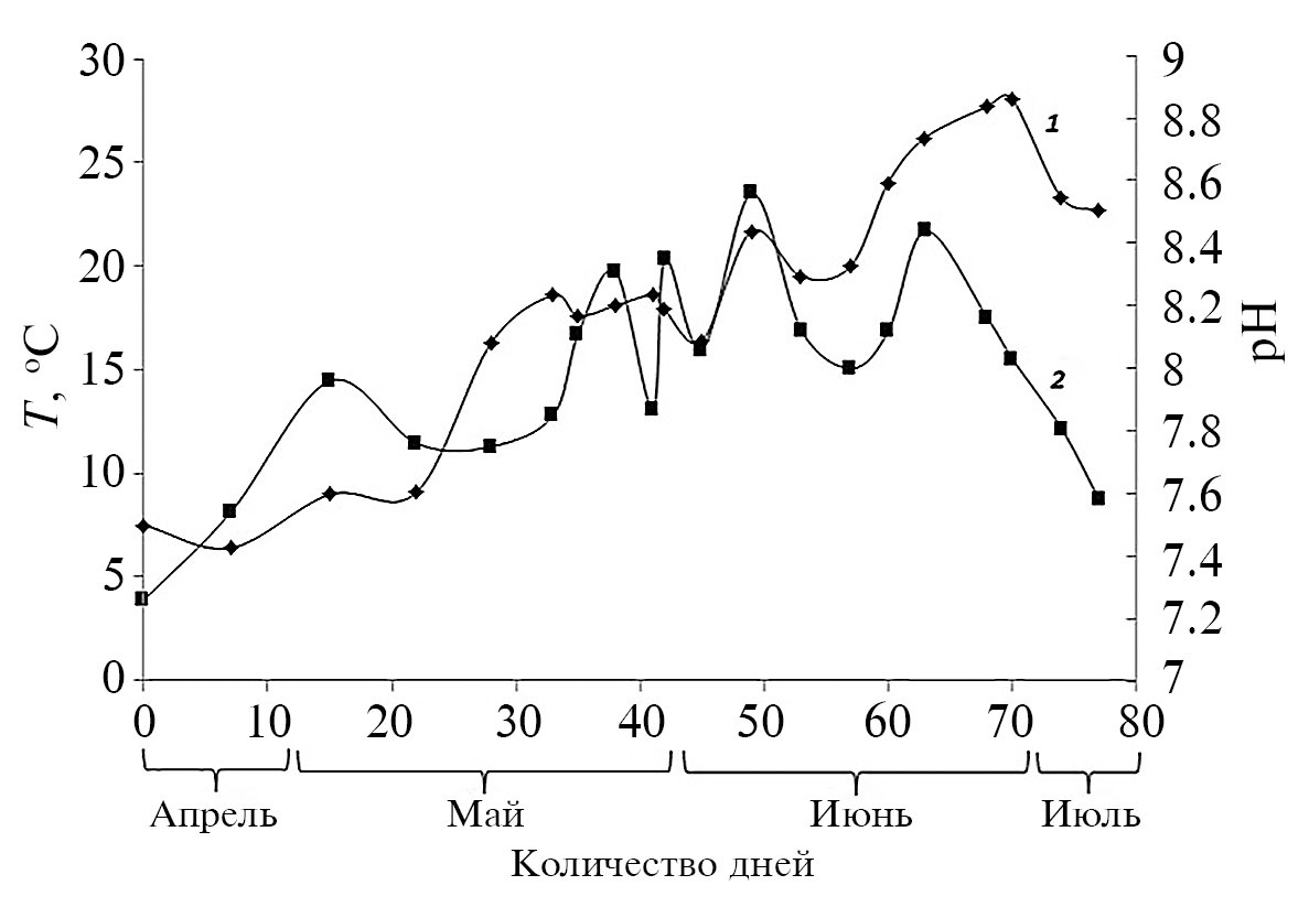 Рис. 1. Динамика изменения температуры (1) и pH (2) воды р. Дубны с 18.04.2021 (координата 0 по оси абсцисс) по 04.07.2021