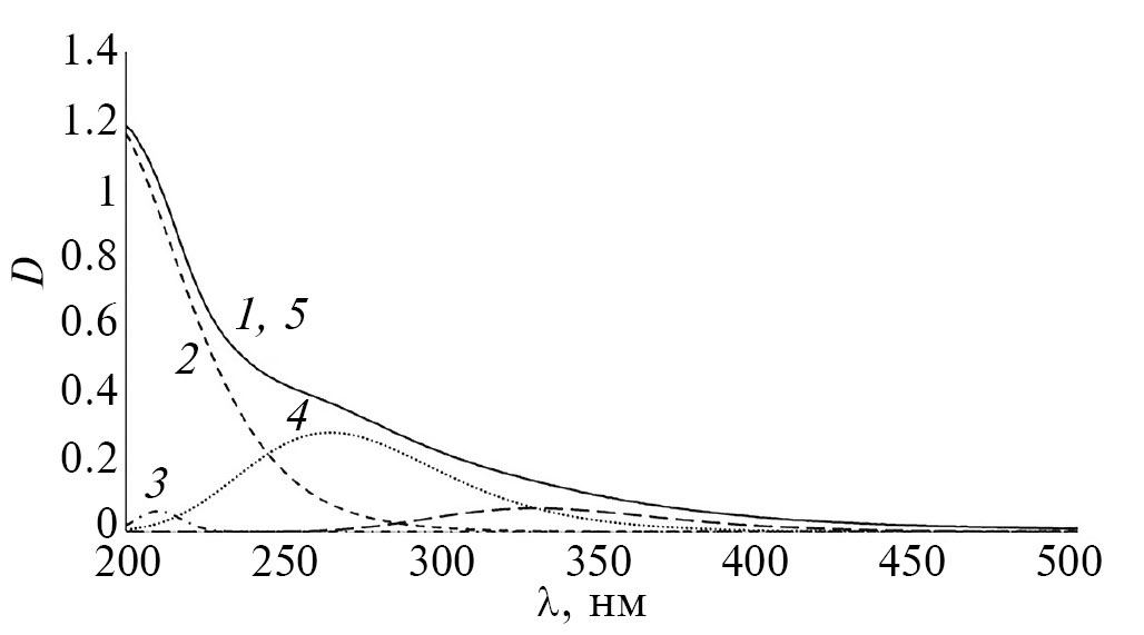 Рис. 3. УФ-спектр и его гауссианы воды р. Дубны от 25.04.2021: 1, 5 – исходный и расчетный спектры, 2 – 196 нм, 3 – 232 нм, 4 – 250 нм