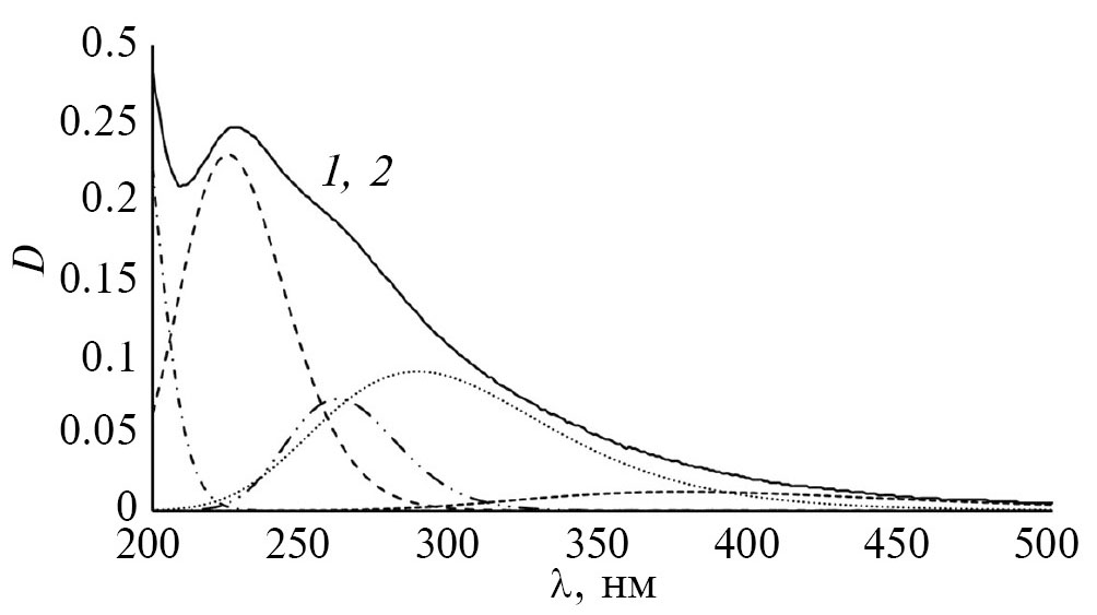 Рис. 5. УФ-спектр и его гауссианы воды р. Дубны от 25.06.2021: 1, 2 – исходный и расчетный спектры