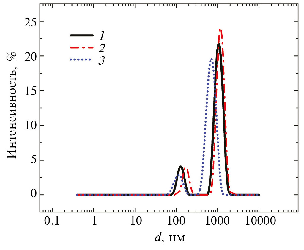 Рис. 6. Кривые распределения размера агрегатов лецитина по интенсивности светорассеяния в дистиллированной воде (1) и в присутствии воды р. Дубны от 25.04.2021 (2) и 26.05.2021 (3). [Лецитин] = 4.3×10–5 моль/л