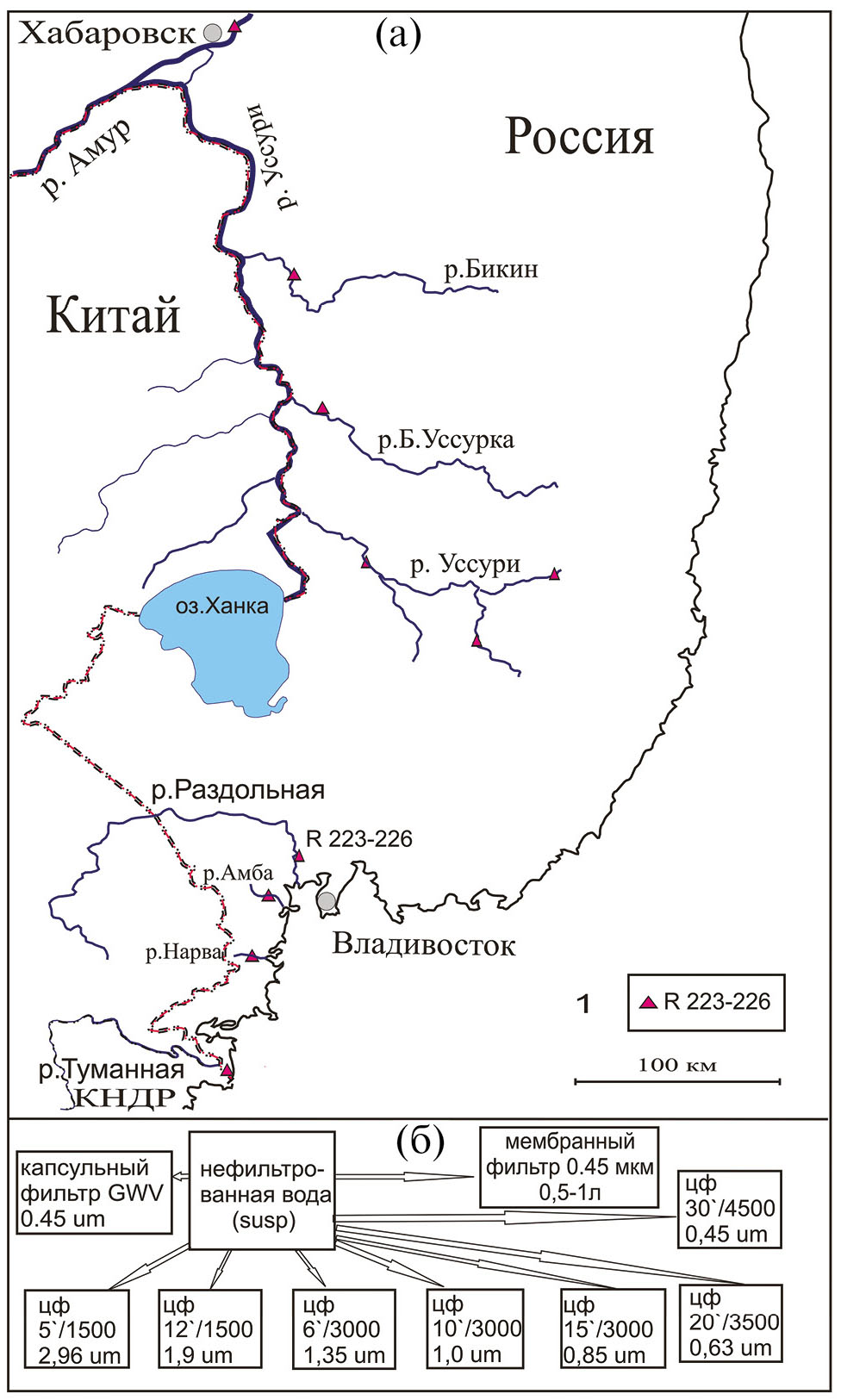 Рис. 1. Схема расположения точек отбора проб речной воды, R 223-226 – место отбора проб для центрифугирования при различных режимах (а); схема обработки проб речной воды (б)