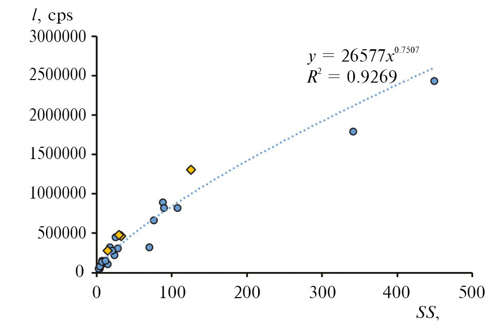 Рис. 2. Интенсивность ДРС (I, cps, counting per sec, имп/с) исходных проб речных вод с различным содержанием взвеси (SS, мг/л), ромбами помечены пробы, использованные для центрифугирования