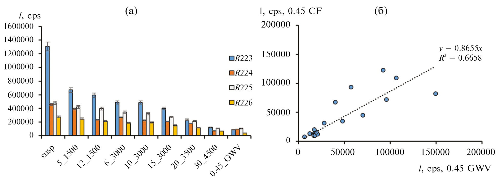 Рис. 3. Интенсивность ДРС (I, cps) в исходных пробах воды р. Раздольной (susp) и при различных режимах центрифугирования и фильтрации через капсульный фильтр (0.45_GWV), вертикальные линии – стандартное отклонение параллелей и повторов (а); Сравнение интенсивности ДРС (I, cps) в супернатантах, полученных центрифугированием 30′ при 4500 об/мин (CF 0.45), и в фильтратах через капсульные фильтры (GWV 0.45) во всех изученных реках юга ДВ РФ, опробованных с сентября 2022 по май 2023 г. (б)