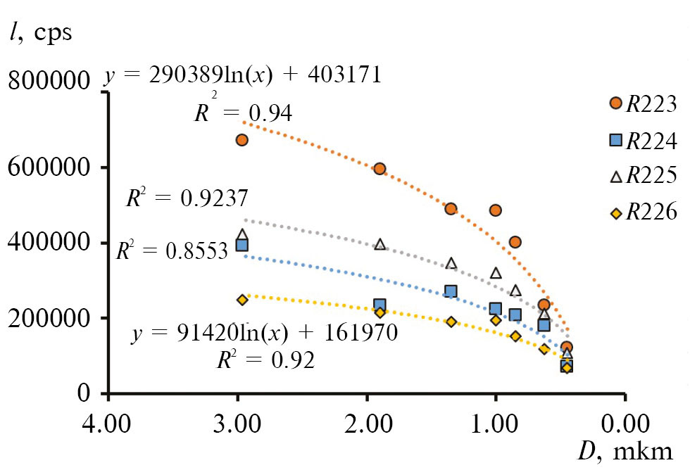 Более детальный анализ динамики снижения интенсивности ДРС центрифугатов по мере уменьшения диаметра осаждающихся частиц речной взвеси свидетельствует о заметном изменении динамики с уменьшением минимального размера частиц, остающихся в супернатанте (рис. 4). При уменьшении минимального размера осаждающихся частиц от 3 до 1 мкм интенсивность ДРС снижается на 20–30%, однако затем при дальнейшем уменьшении от 1 до 0.45 мкм интенсивность ДРС падает в 3–4 раза, т. е. снижение происходит по логарифмическому закону со значимым коэффициентом детерминации. Если принять, что интенсивность ДРС пропорциональна содержанию частиц, то это значит, что масса фракции 1–3 мкм в изученных пробах воды р. Раздольной заметно меньше, чем фракции 0.45–1.0 мкм.