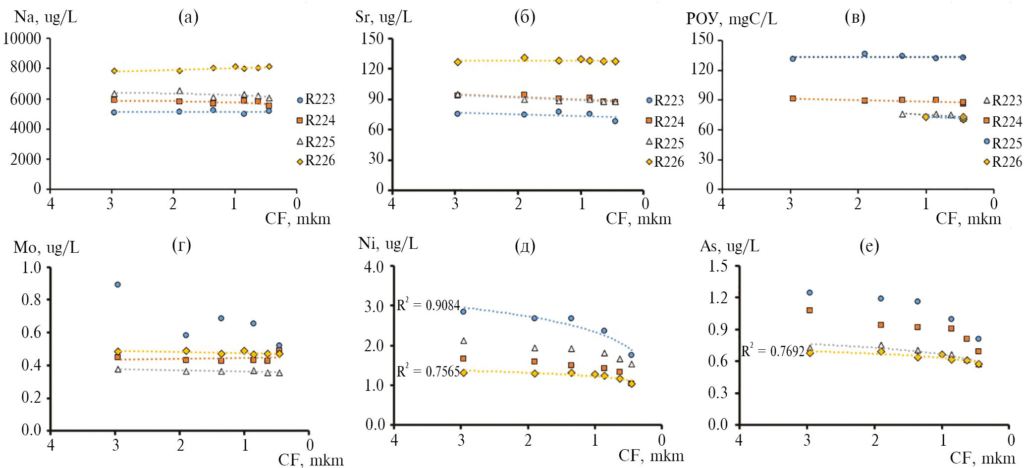 Очевидно, что изменение концентрации химических элементов в супернатантах, полученных при различной интенсивности центрифугирования, будет зависеть от доли взвешенных и крупноколлоидных форм, способных к осаждению, в общем содержании элемента в воде. Если доминируют растворенные ионные формы и комплексы, или мелкие коллоиды, не осаждающиеся при использовавшихся режимах центрифугирования, концентрация химических элементов в супернатантах будет оставаться постоянной. Однако формы, связанные со взвесью (> 1.0 мкм) или крупными коллоидами (0.45–1.0 мкм), будут осаждаться, и концентрация в супернатанте должна уменьшаться с увеличением интенсивности центрифугирования, т. е. с уменьшением размера осаждающихся частиц. Действительно, концентрация в центрифугатах элементов с резким доминированием растворенных ионных форм в речных водах (Na, K, Ca, Mg, B, Sr) не зависит от интенсивности центрифугирования, и это наблюдалось при всех изученных водных режимах для р. Раздольной (рис. 5a, 5б, пример для Na и Sr). Концентрация растворенного органического углерода (РОУ) также не обнаруживает заметного снижения при интенсификации центрифугирования и уменьшения рассчитанного размера осаждаемых частиц от 3 до 0.45 мкм (рис. 5в). Это свидетельствует о нахождении органического углерода в речных водах в растворенных и мелкоколлоидных формах, что подтверждается детальными исследованиями речных вод с использованием ультрафильтрации [21]. Для Мо постоянная концентрация в центрифугатах наблюдается в большинстве случаев, за исключением паводка (R223), когда концентрация Мо снижалась в 1.5 раза при интенсификации центрифугирования (рис. 5г). В то же время для большого числа элементов также с преобладанием растворенных форм в речных водах (Li, Si, Mn, Co, Ni, Cu, As, Se, Rb, Cs, Ba, U), относительно постоянная концентрация в центрифугатах наблюдается, напротив, только для пробы R226, отобранной в предзимнюю межень в декабре при низком содержании взвеси (14.2 мг/л). При повышении содержания взвеси до 29–32 мг/л (R224, 225), особенно в паводок (R223) при количестве взвеси 126 мг/л, имеет место заметное (в 1.6–2.2 раза) снижение концентрации по мере возрастания скорости центрифугирования и уменьшения размера осаждающихся частиц (рис. 5д, 5е, пример для Ni и As). Это свидетельствует о миграции заметной части этих элементов в высокую воду в виде тонкой пелитовой взвеси (1–3 мкм) и крупных коллоидов (0.45–1.0 мкм).