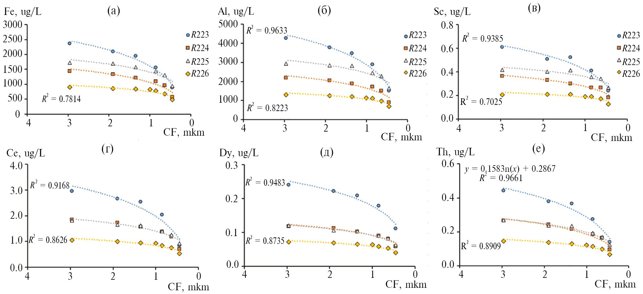 Рис. 6. Изменение концентрации (мкг/л) в центрифугатах c уменьшением минимального размера осаждающихся частиц (CF мкм) для химических элементов с высокой долей взвешенных и крупно-коллоидных форм в речных водах (Fe, Al, Sc, Ce, Dy, Th)