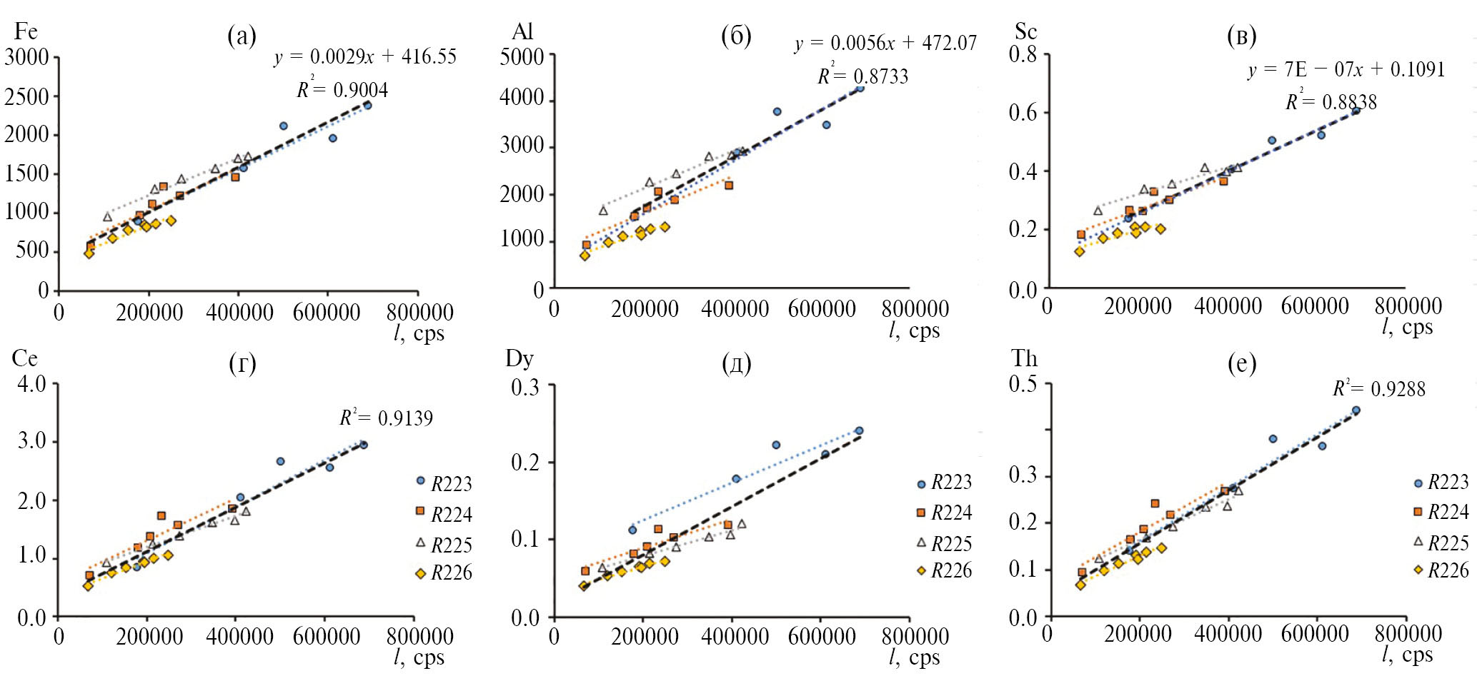Рис. 7. Зависимость концентрации в центрифугатах от интенсивности ДРС (I, cps/имп/с) для химических элементов (мкг/л) с высокой долей взвешенных и крупно-коллоидных форм (Fe, Al, Sc, Ce, Dy, Th)