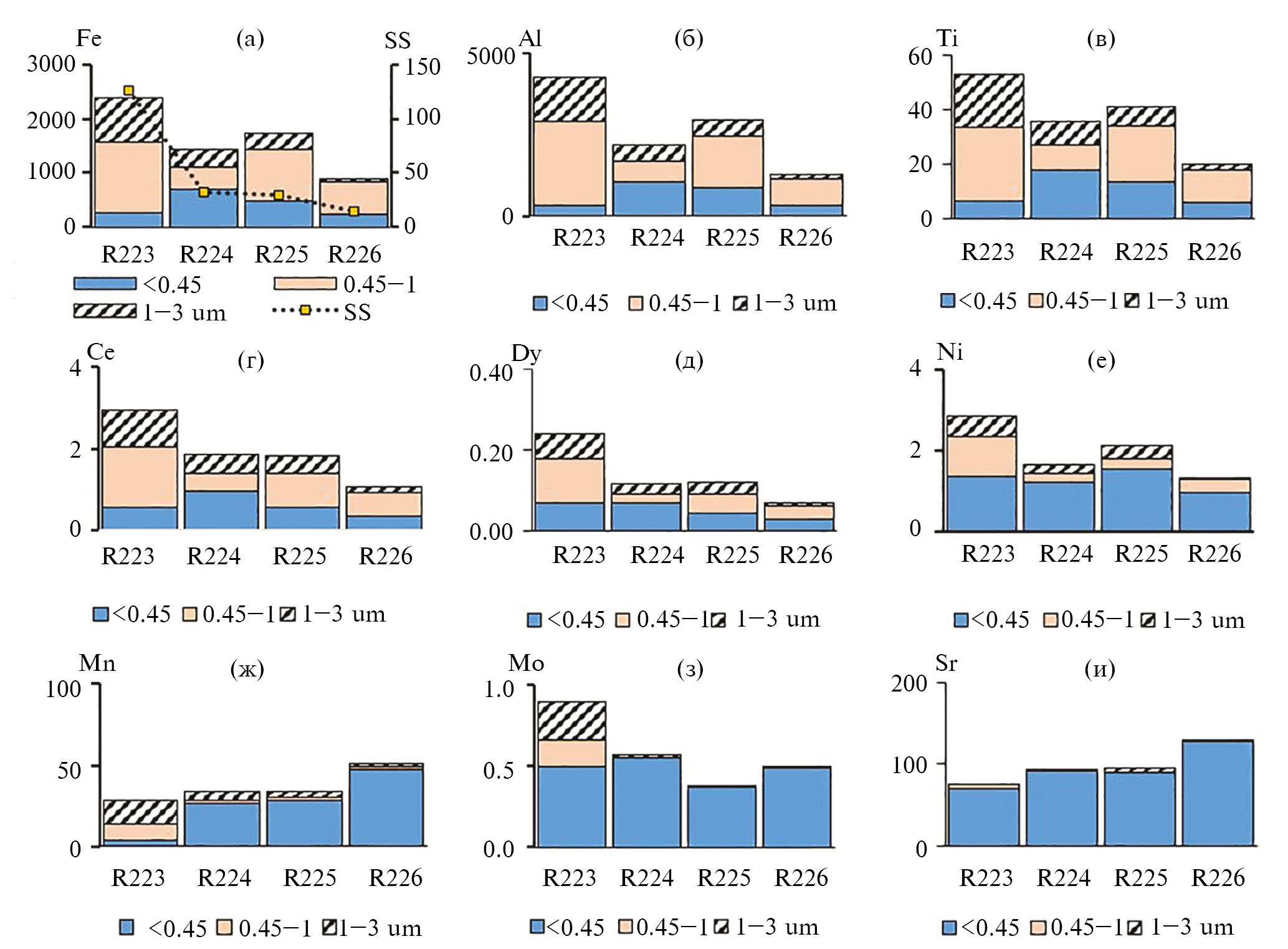 Рис. 8. Изменение концентрации (мкг/л) растворенных/коллоидных (0.45 мкм), крупно-коллоидных (0.45–1 мкм), тонко-пелитовых (1–3 мкм) форм некоторых химических элементов в водах р. Раздольной от осеннего паводка (R223) до предзимней межени (R226) на фоне снижения содержания взвеси (SS) от 126 до 14 мг/л (а)