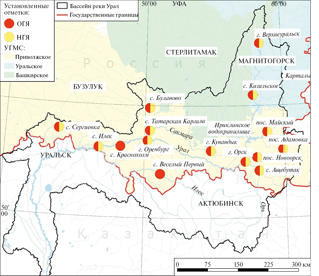 Помимо приведенных в табл. 1, имелись отметки ОГЯ и НГЯ для высших уровней воды за период 2019–2022 гг. За этот период изменились лишь отметки НГЯ в 2020 г. для постов р. Урал – г. Верхнеуральск (с 230 см до 270 см) и р. Урал – с. Кизильское (450 см до 520 см).