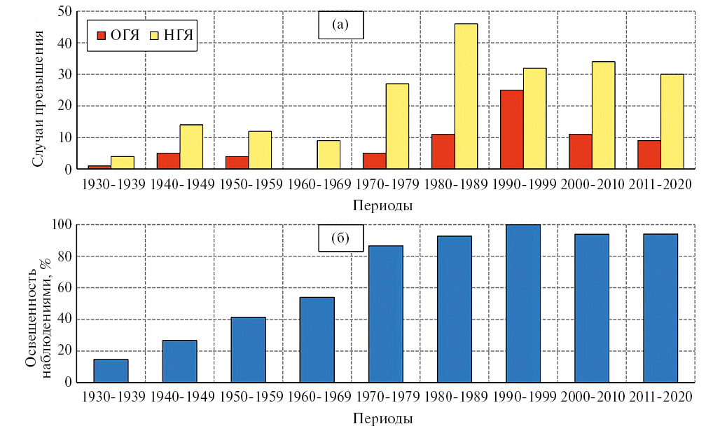 При рассмотрении динамики многолетних изменений ОГЯ и НГЯ необходимо учитывать степень развития гидрологической сети, которая на рис. 2б представлена как “освещенность наблюдениями”. Здесь под освещенностью наблюдениями понимается суммарное количество случаев высших уровней воды, наблюденных на рассматриваемых постах, выраженное в процентах от максимальной освещенности наблюдениями за десятилетие, когда за каждый год для каждого рассматриваемого поста имеется отметка высшего уровня воды. Как следует из рис. 2, увеличение количества наводнений с превышением отметок ОГЯ и НГЯ произошло одновременно с открытием новых постов и налаживанием регулярных наблюдений на действующих постах.