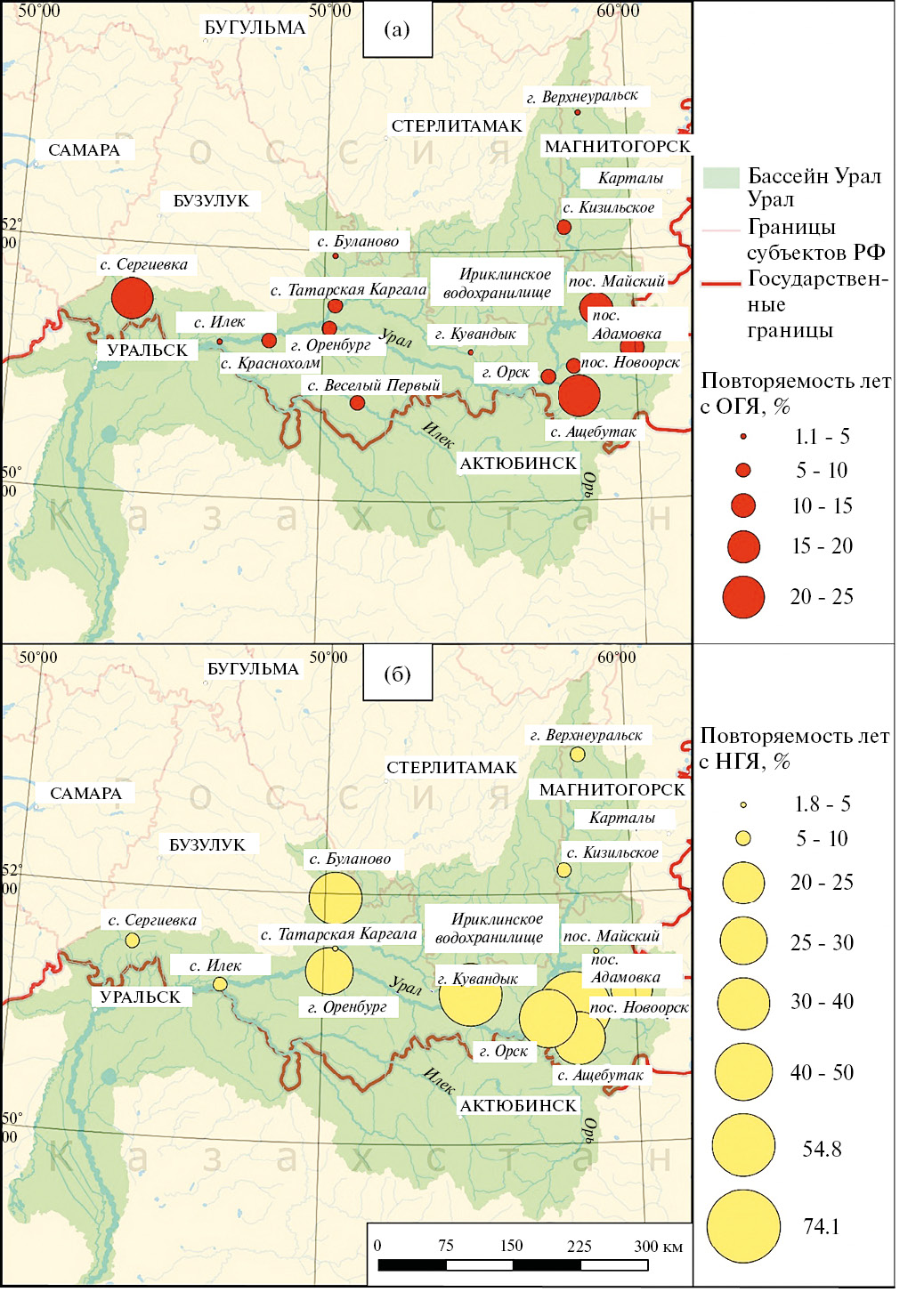 Выполненные исследования позволили выделить гидрологические посты с наиболее высокой повторяемостью превышения отметок ОГЯ и НГЯ. Так, для постов р. Жарлы – пос. Адамовка, р. Суундук – пос. Майский, р. Чаган – с. Сергиевка и р. Орь – с. Ащебутак повторяемость лет с превышением отметки ОГЯ составляет от 11 до 25% (рис. 3а). Для более половины (7 из 15) постов повторяемость НГЯ > 20%. Обращает на себя внимание практически ежегодное превышение отметок НГЯ (рис. 3б) на постах р. Большой Кумак – пос. Новоорск, р. Сакмара – г. Кувандык и р. Урал – г. Орск.