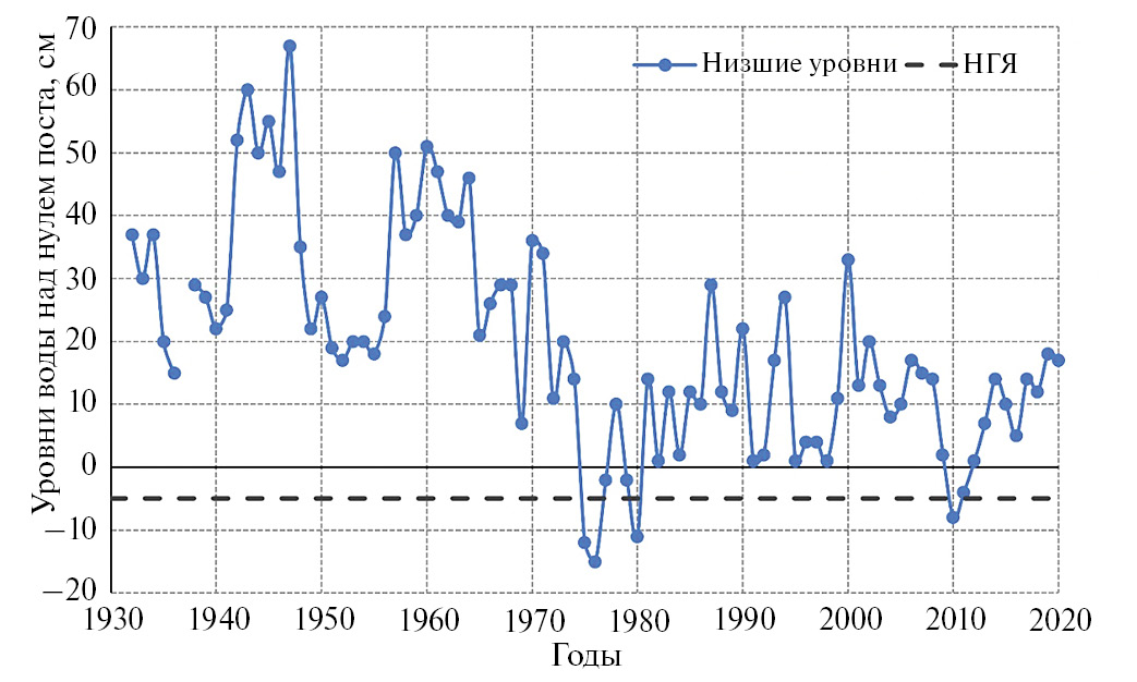 На р. Урал у г. Верхнеуральска повторяемость НГЯ составила 4.5%. Падение уровня воды ниже отметок НГЯ началось после 1975 г. С этого года наблюдается перелом в ходе низших уровней воды. Так, уровни воды за период 1975–2020 гг. в среднем на 74% ниже, чем за предыдущий период (1932–1974 гг.). В 76% случаев низшие уровни воды на посту отмечены в период открытого русла, причем это соотношение не изменилось после 1975 г. Причиной перелома в ходе низших уровней воды может быть начавшаяся с 1970-х гг. фаза пониженной водности для стока летне-осенней межени на посту [3]. Согласно [5], в будущем повторяемость маловодных лет может увеличиться, а к середине XXI в. ожидается общее климатически обусловленное сокращение стока рек на 10–20% (на 20–30% при наихудшем сценарии), что может увеличить повторяемость НГЯ и затруднить водоснабжение населения водой.