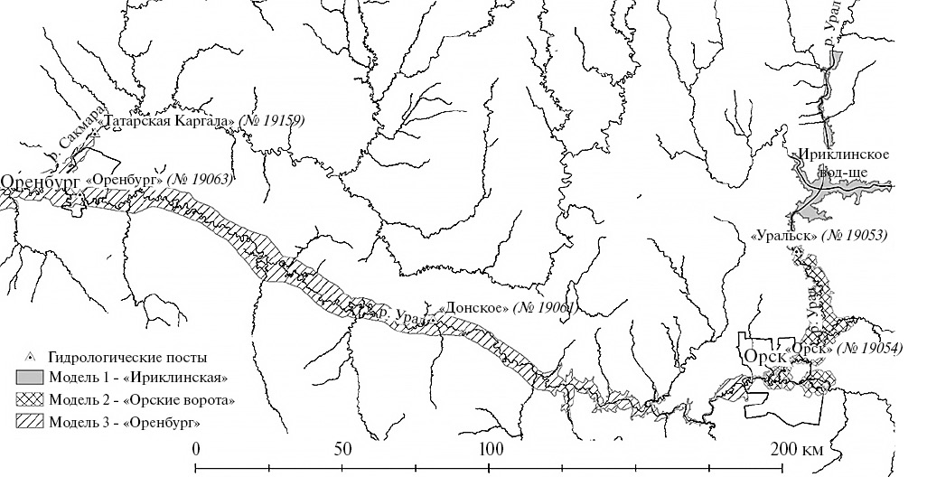 Участок моделирования расположен в среднем течении р. Урал и включает в себя Ириклинское водохранилище и область от нижнего бьефа Ириклинского гидроузла до с. Шуваловского (50 км ниже г. Оренбурга). Общая протяженность участка моделирования по руслу р. Урал (включая Ириклинское водохранилище) составляет >700 км (рис. 1).