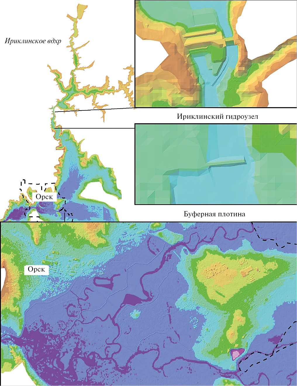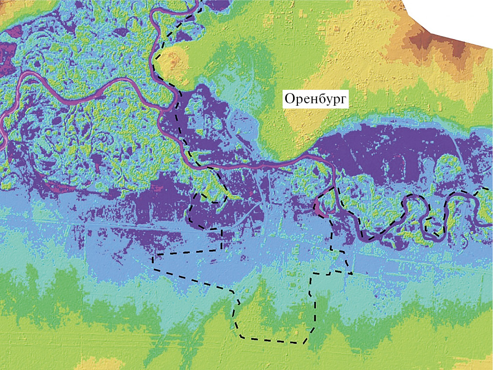 Рельеф русла р. Урал частично получен в результате инженерно-гидрографических работ, выполненных в 2023 г. На остальных участках, для которых не требовалась детализация, рельеф дна русла трапецеидального профиля из условия глубины от уреза в меженных условиях: от Ириклинского гидроузла до г. Орска – 3 м, в г. Орске – 1.5–2.0 м, на участке от г. Орска до г. Оренбурга – 1.5 м, ниже г. Оренбурга – 1 м. Глубины откорректированы в процессе верификации гидродинамической модели, уклон определен по урезам с топокарт М 1 : 100 000. Сооружения Ириклинского гидроузла и буферной плотины восстановлены с чертежей сооружений. Рельеф Ириклинского водохранилища откорректирован относительно кривой объемов и уровней. Детальная ЦМР от Ириклинского водохранилища до г. Орска приведена на рис. 4, в районе г. Оренбурга – на рис. 5.