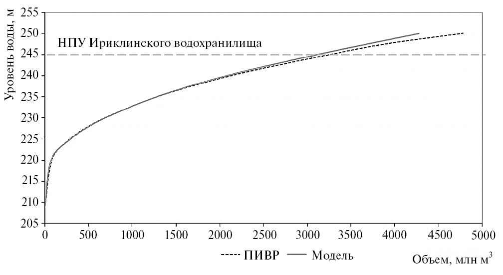Сопоставление зависимостей объемов Ириклинского водохранилища от уровня воды из ПИВР и полученной на численной модели приведено на рис. 7, причем небольшое расхождение начинается уже при превышении НПУ водохранилища.