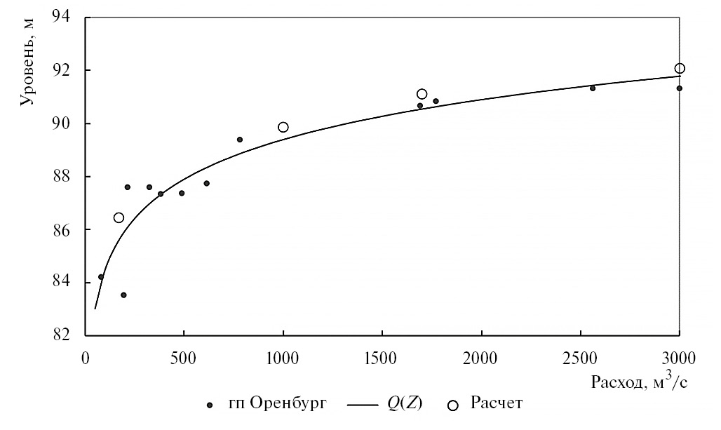 Процесс калибровки был осложнен недостаточностью данных по рельефу и разрозненностью гидрологических наблюдений на гидропостах. Коэффициенты шероховатости в русле варьировали от 0.022 до 0.027, на пойме – 0.04 для участков полей, 0.045 для заросших участков и 0.06 для участков с высокой растительностью и застройкой. В результате калибровки модели 2 построена Q(Z), представленная на рис. 8.