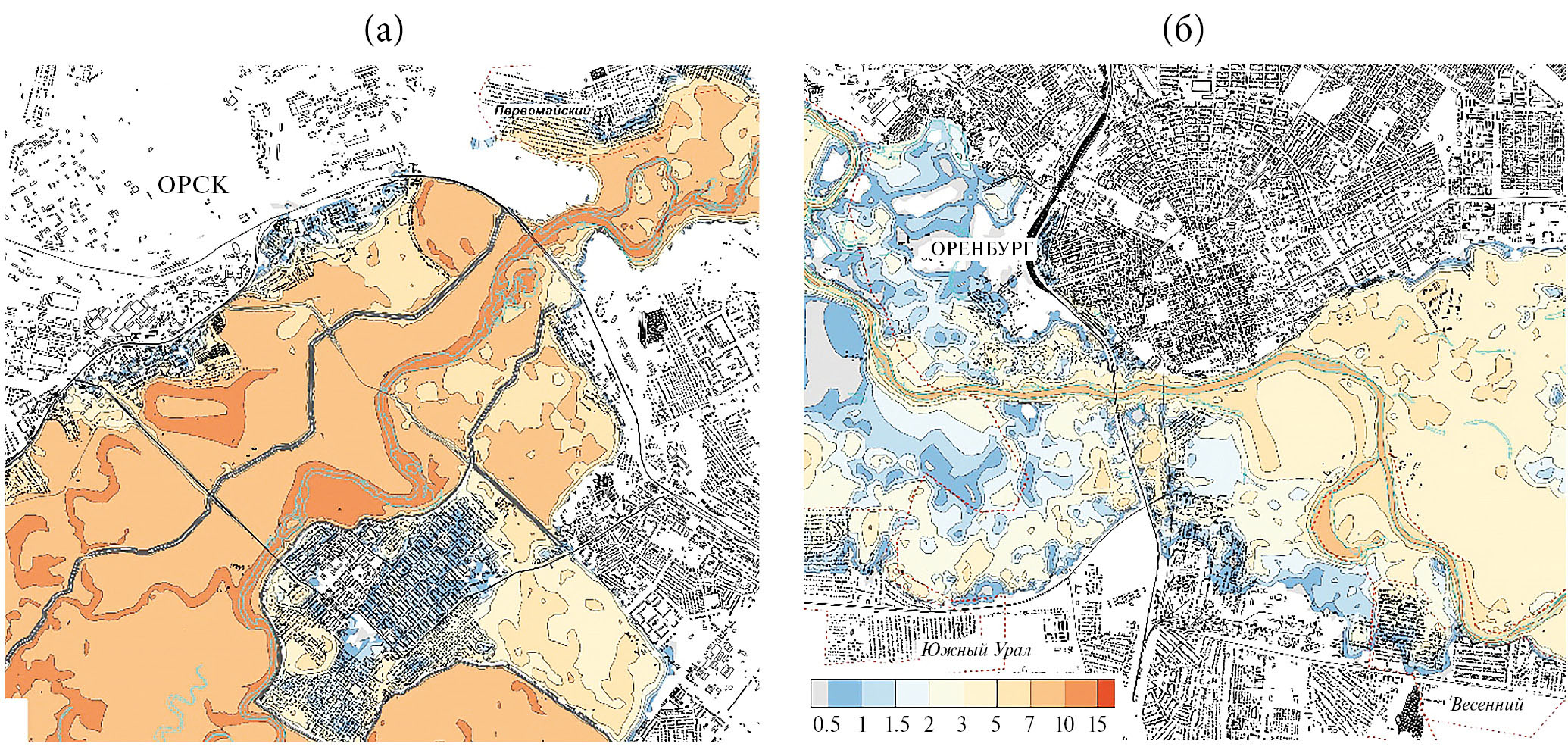 Рис. 12. Максимальные глубины затопления в городах Орске (а) и Оренбурге (б) при аварии на Ириклинской плотине по сценарию 1.