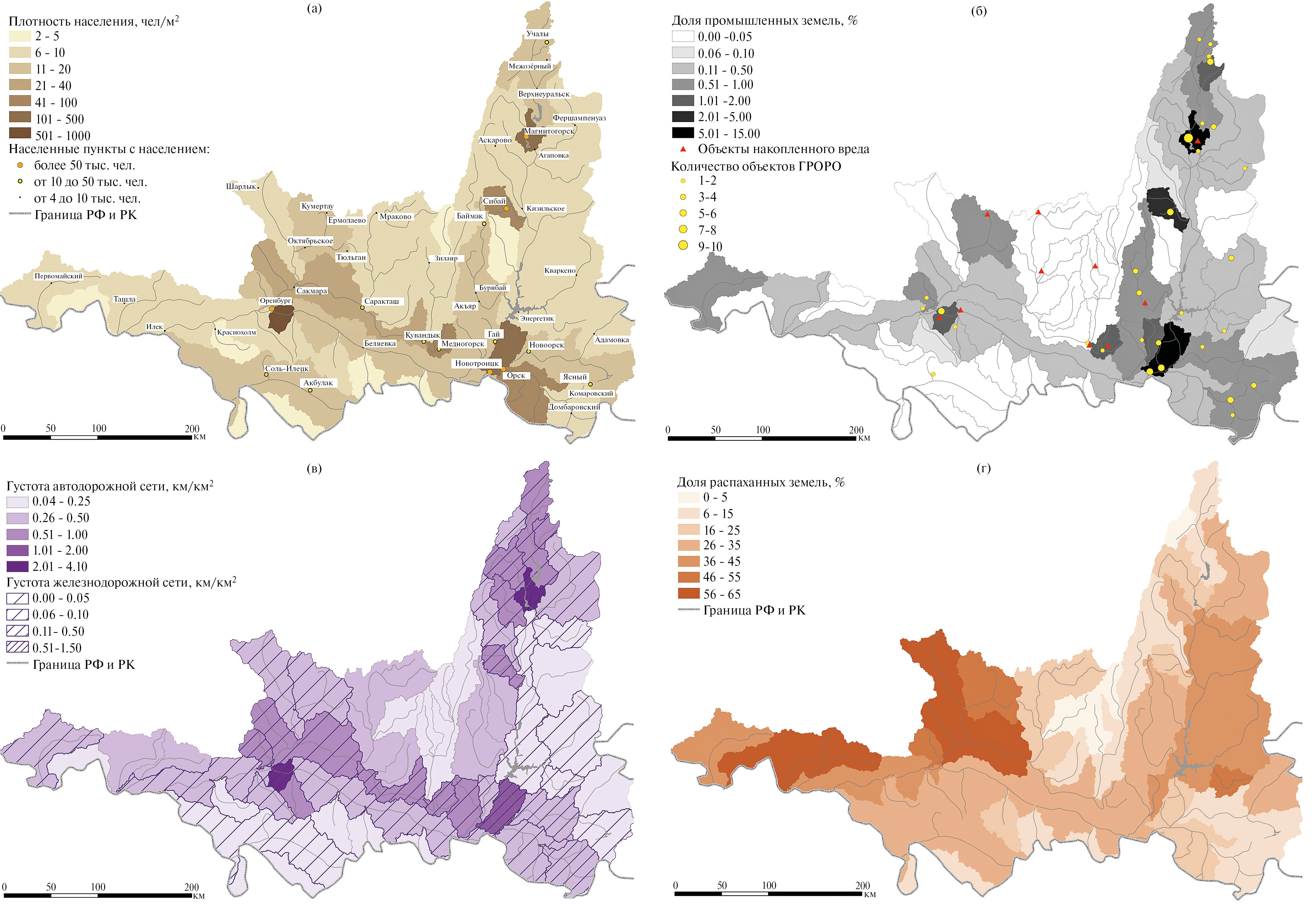 Анализ неравномерности пространственного распределения факторов антропогенной нагрузки проведен в разрезе 50 частных водосборов. Среди основных антропогенных факторов, формирующих нагрузку на водные объекты, можно выделить селитебную нагрузку (рис. 2а), развитие промышленного комплекса (рис. 2б) и транспортной инфраструктуры (рис. 2в), сельскохозяйственное освоение территории водосбора (рис. 2г), наличие объектов накопленного экологического вреда и объектов размещения отходов (рис. 2б).