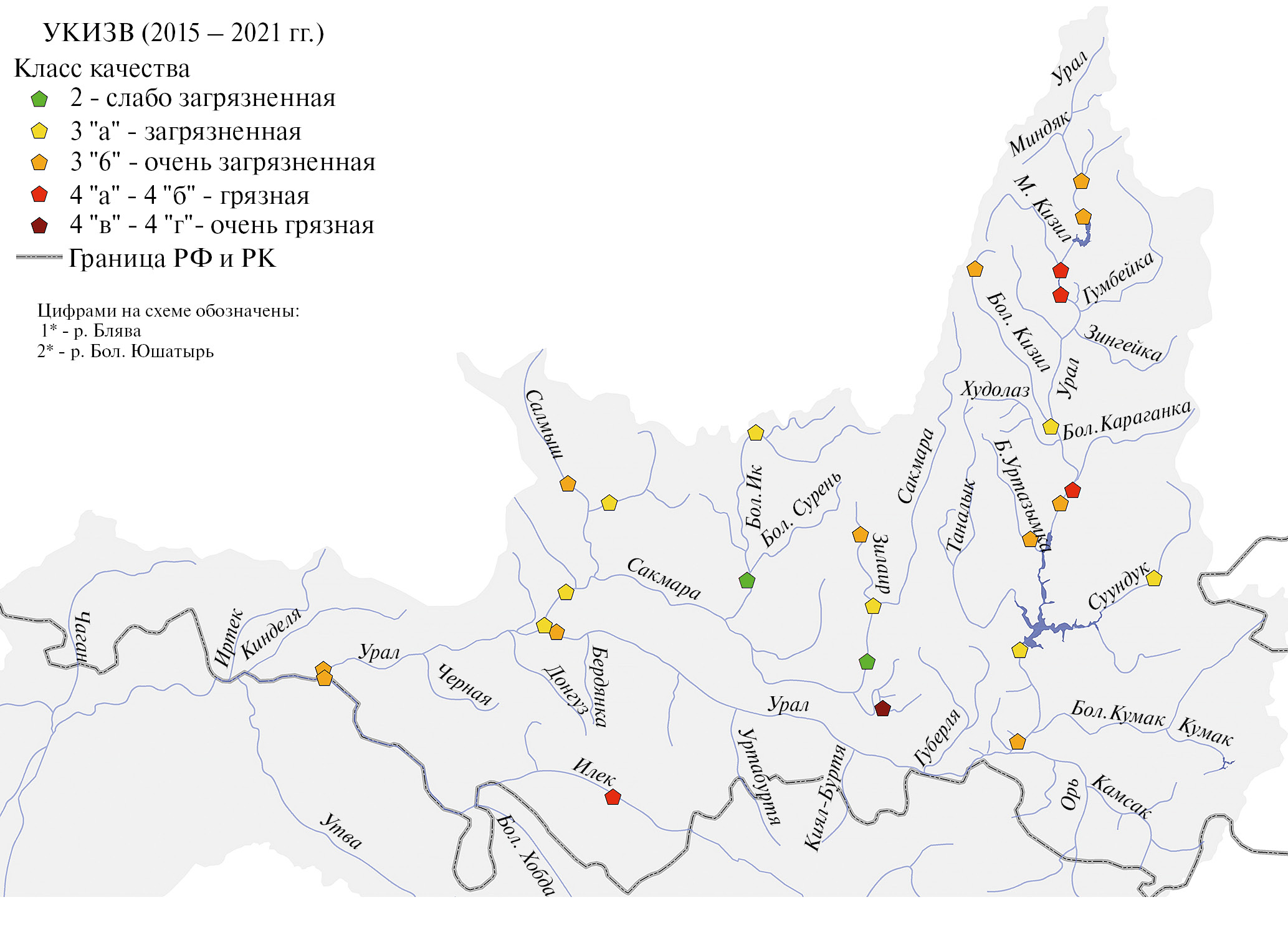 Наибольшая загрязненность вод в российской части бассейна характерна для Магнитогорского водохранилища и р. Урал ниже г. Магнитогорска (в среднем за 2015–2021 гг. класс 4 “а” – вода грязная), р. Блявы (класс 4 “г” – очень грязная) и р. Илек (класс 4 “а”– грязная) (рис. 3).