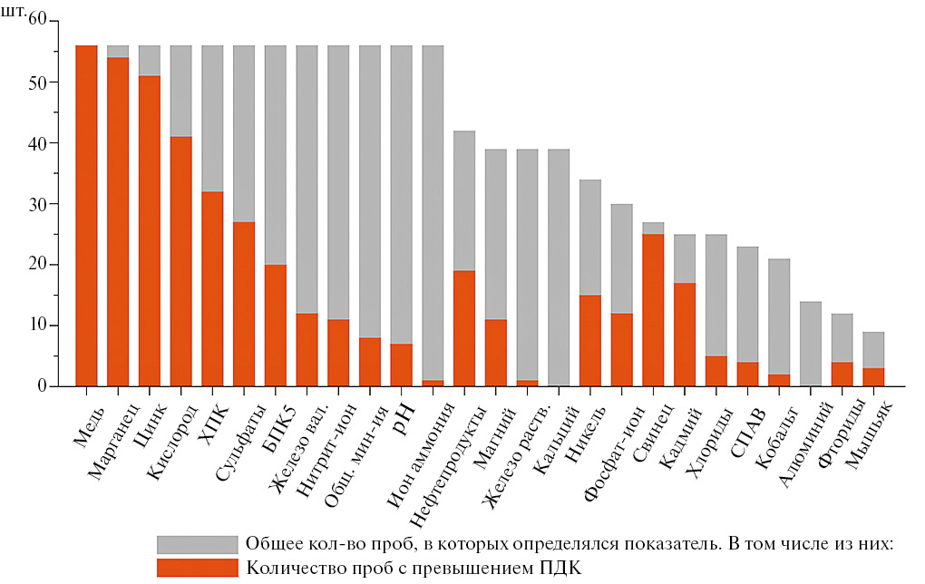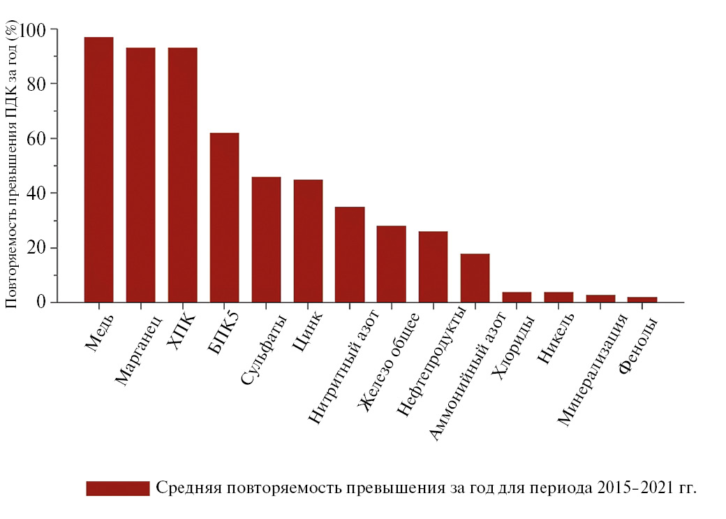 Отмечено стабильное и практически повсеместное превышение предельно допустимых концентраций (ПДК) по меди – повторяемость превышения 91–100% в разные годы, очень частое превышение по ХПК (83–97%) и марганцу (76–98%), частое превышение по цинку (36–73%), БПК5 (56–70%) и сульфатам (34–57%) (рис. 4) [21]. Регулярные нарушения (в среднем от 18 до 35%) отмечаются по содержанию нитритного и аммонийного азота, железа, нефтепродуктов [21].