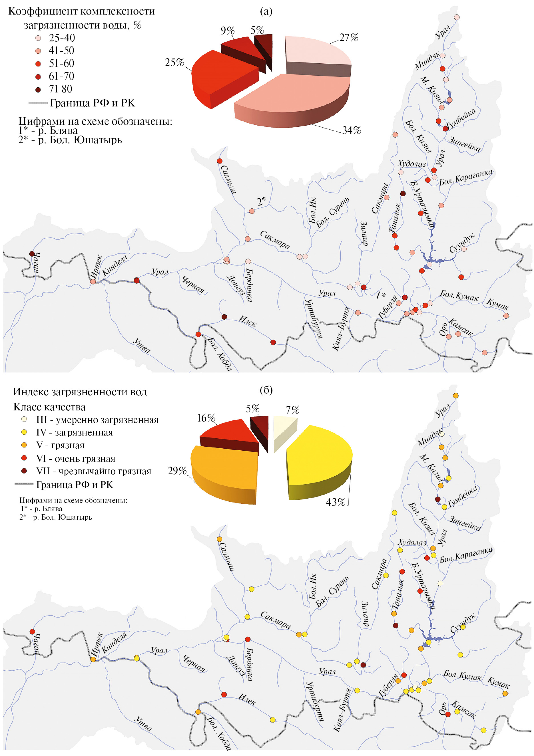 Рис. 6. Качество воды водных объектов бассейна р. Урал по комплексным показателям К (а) и ИЗВ (б), по данным полевого обследования 2022 г.