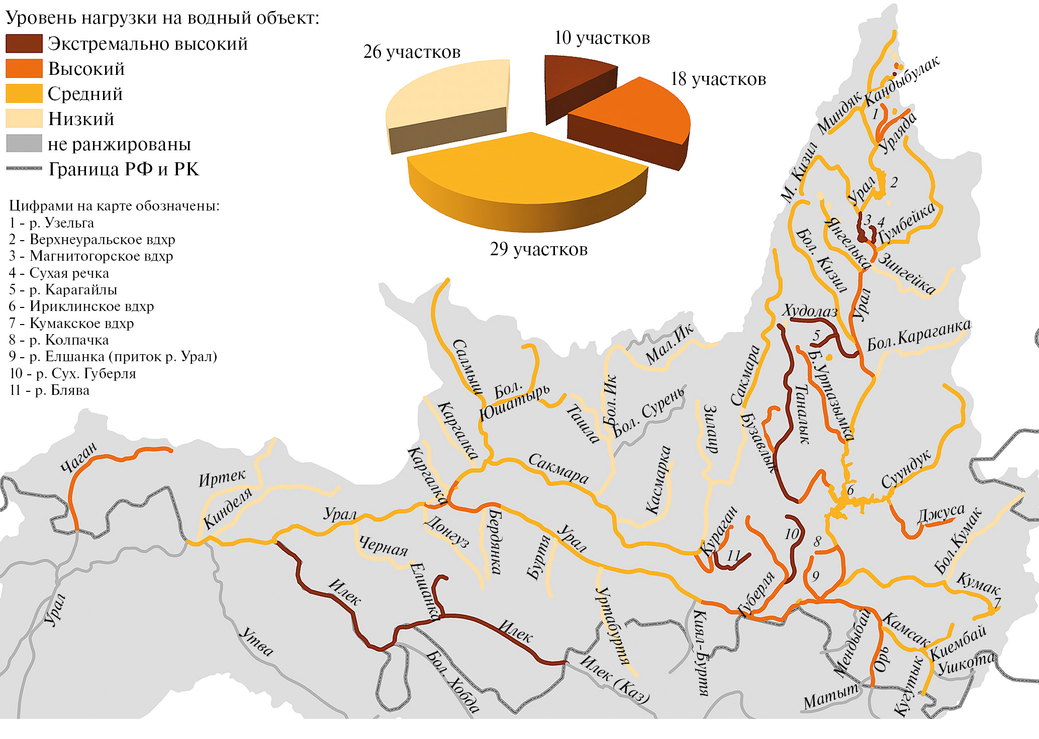 При ранжировании выделено 4 уровня нагрузки на водные объекты: экстремально высокий, высокий, средний и низкий. Для наиболее крупных рек бассейна (Урал, Сакмара, Таналык) ввиду неоднородности степени антропогенной нагрузки и загрязненности вод по длине реки ранжирование проведено не для всего водного объекта в целом, а для его участков. Всего в каталоге значится 83 участка на 73 водных объектах (55 рек, 4 водохранилища и 14 озер).