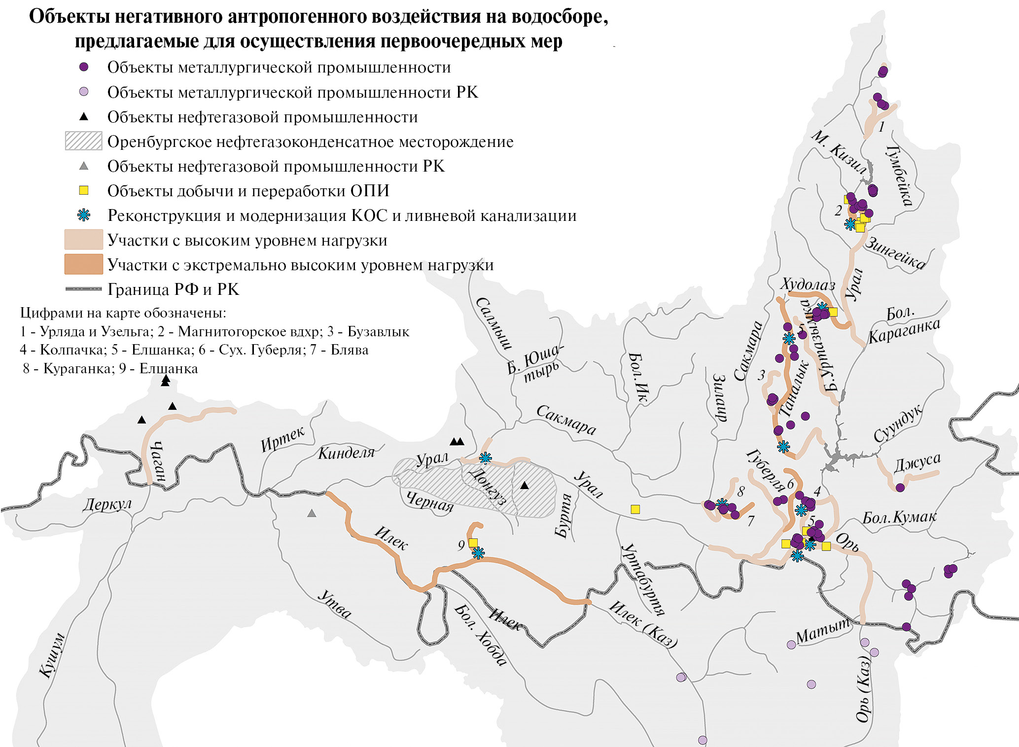 Главные антропогенные факторы загрязнения водных объектов в бассейне р. Урал – производственный и селитебный. К территориям с наибольшей антропогенной нагрузкой относятся участки водосбора, в пределах которых расположены города с численностью населения более 20 тыс. человек, совмещенные с крупными промышленными, преимущественно добывающими и горно-обогатительными, центрами: Оренбург, Магнитогорск, Орск, Новотроицк, Гай, Медногорск, Сибай, Баймак, Учалы в РФ и Актобе и Хромтау в Республике Казахстан (РК). Помимо максимальной селитебной и производственной нагрузки для этих участков характерны также наличие крупных транспортных узлов и наибольшая концентрация объектов, входящих в государственный реестр объектов размещения отходов (ГРОРО). Соответственно, к водным объектам, расположенным в зоне наибольшего антропогенного воздействия, относятся реки Блява, Таналык, Худолаз, Орь, Илек, Сухая Губерля, Елшанка, Колпачка, а также Магнитогорское водохранилище и р. Урал в районе городов Орска, Новотроицка и Оренбурга.