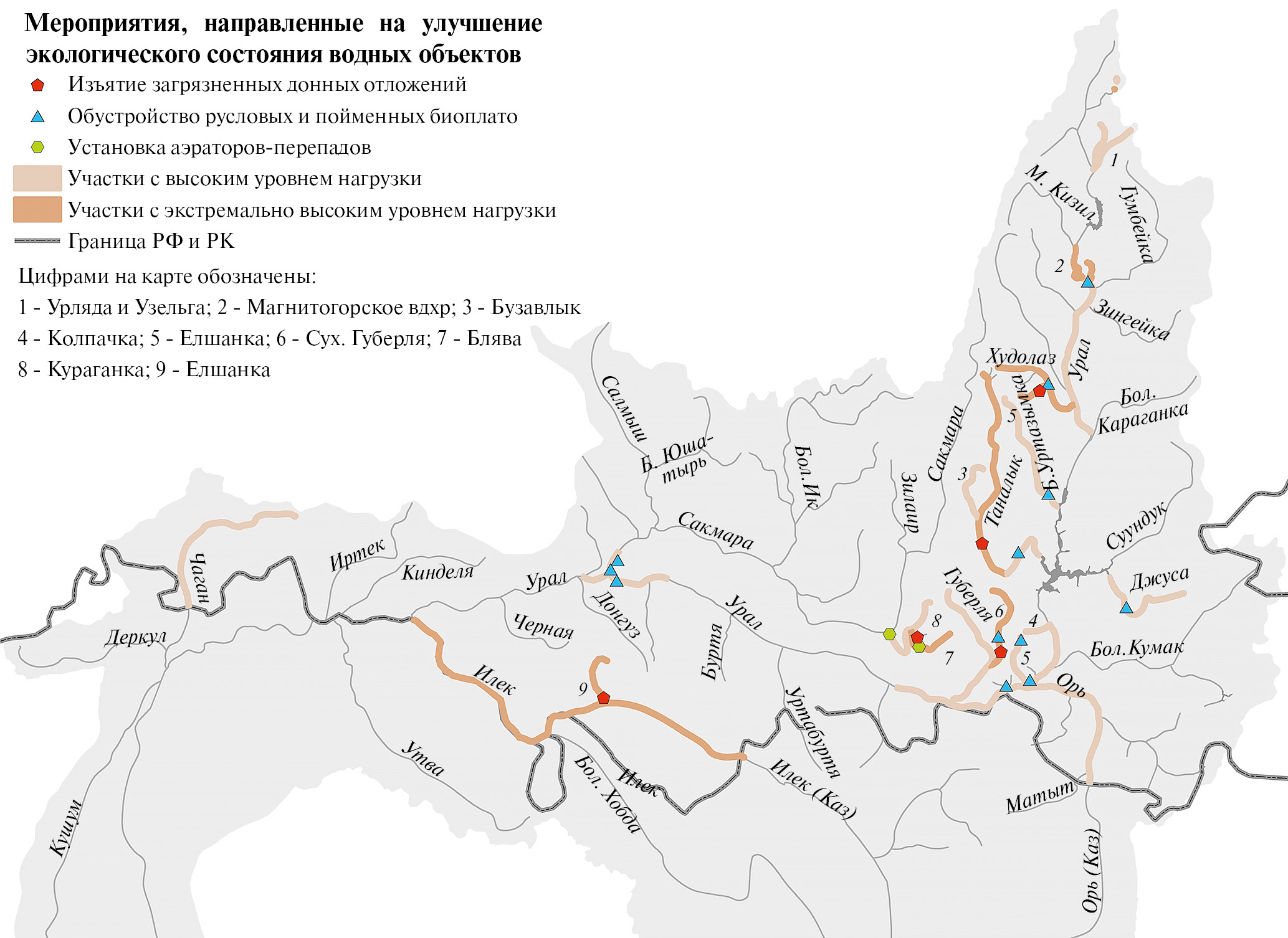 К водным объектам с высоким уровнем нагрузки отнесены реки Урляда, Узельга, Большая Уртазымка, Бузавлык, Джуса, Елшанка (приток р. Урал), Колпачка, Губерля, Орь, Чаган, Кураганка, участки р. Урал в пределах и ниже городов Магнитогорска, Орска, Новотроицка, Оренбурга, участок р. Сакмары в Оренбурге, а также оз. Большое Учалы.