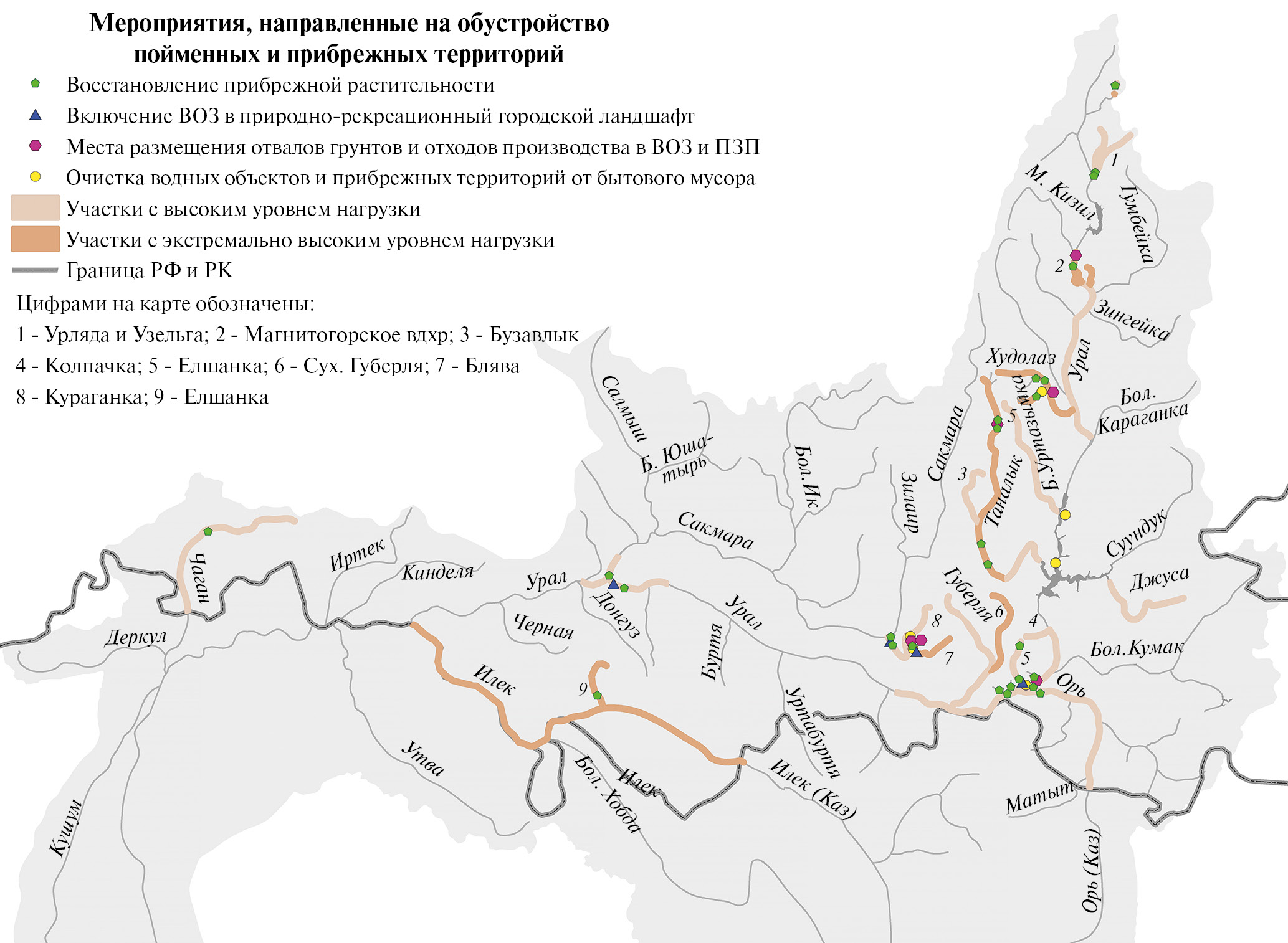 В рамках данной группы методов в бассейне р. Урал предложены пилотные участки для проведения работ по организации и поддержанию режима ВОЗ, а также по восстановлению околоводной и прибрежной растительности на участках рек, в том числе малых, в пределах населенных пунктов (рис. 10). Необходимо устранить имеющиеся в настоящее время нарушения режима ВОЗ и прибрежных защитных полос (ПЗП) в части запрета на размещение отходов производства и потребления, в том числе бытового мусора, и отвалов размываемых грунтов в целях защиты водных объектов от попадания фильтрата, насыщенного ЗВ. Рекомендуется также включение в природно-рекреационный городской ландшафт ВОЗ р. Блявы в г. Медногорске, р. Кураганки в г. Кувандыке, р. Елшанки в г. Орске, р. Урал в г. Оренбурге [22].