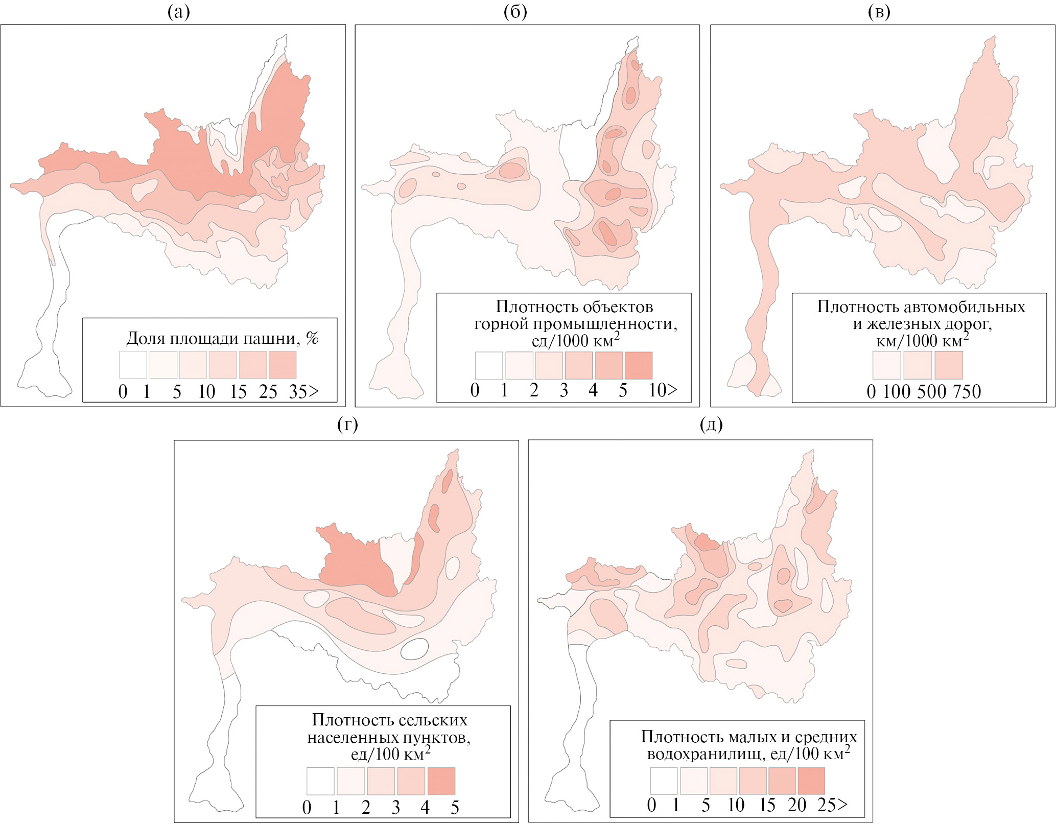 Особенности пространственного распределения гидротехнических объектов, регулирующих речной сток и созданных для обеспечения нужд промышленности, коммунального хозяйства и сельскохозяйственного производства, рассмотрены в [8], где приведена обобщающая схема распределения малых водохранилищ и прудов, преимущественно сельскохозяйственного назначения (рис. 1д).