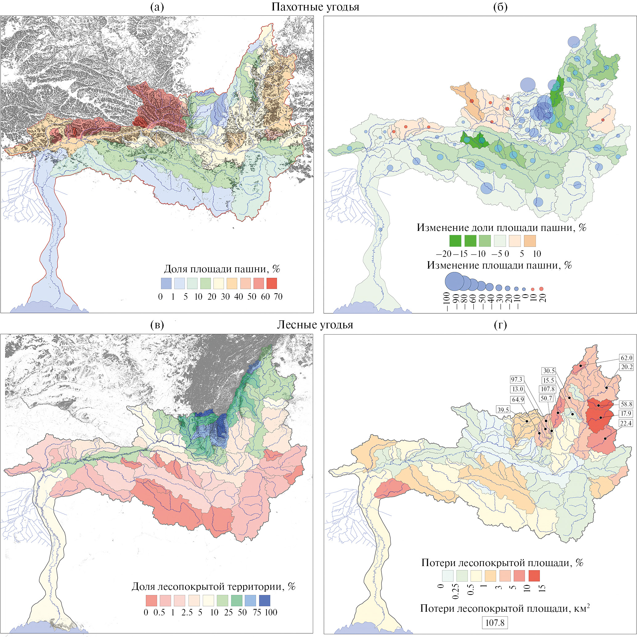 Рис. 2. Показатели фоновых видов природопользования и их многолетняя динамика в водосборах бассейна р. Урал: а – доля пахотных угодий; б – изменение доли и площади пашни за 2003–2019 гг.; в – доля лесопокрытой территории; г – распределение потерь лесного покрова за 2000–2020 гг.
