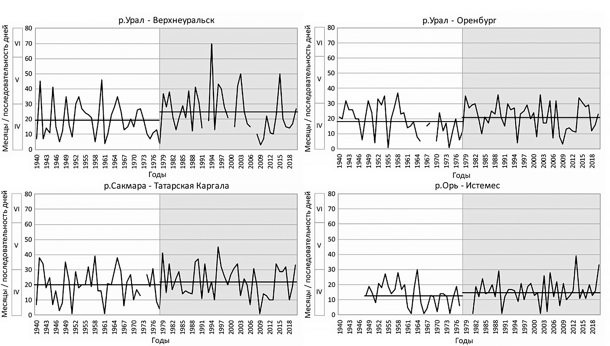 Ключевой фактор формирования благоприятных эколого-гидрологических условий для нереста осетровых – продолжительность стояния высоких уровней весеннего половодья. Данный параметр важен, в частности, для формирования оптимального температурного режима, необходимого для эффективного естественного воспроизводства осетровых. В целом, максимальные уровни на р. Урал (с. Илек) обычно удерживаются до 3–5 дней, относительно высокие – 20–25 дней. Например, в 1983 г. продолжительность стояния высоких уровней (800–850 см) составила 25 сут (с 14 апреля по 8 мая), что, несомненно, повлияло на параметры обводненности нерестовых участков. В маловодный 2020 г. наиболее продолжительный (10 сут) период соответствовал низким уровням весеннего половодья – 276–306 см.