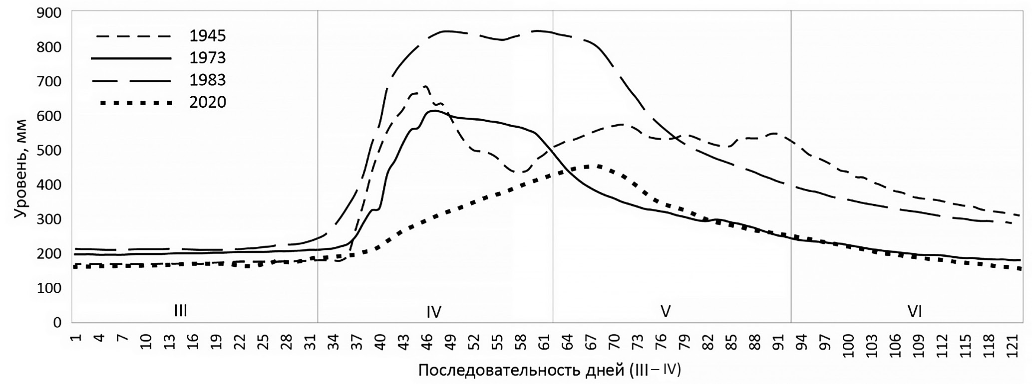 В целом, в годы средней водности (1943, 1983 гг.), независимо от особенностей гидрологического режима (условно-естественный или зарегулированный), частота (повторяемость) наивысших уровней составляет в среднем 50–60% (преимущественно в апреле), что обеспечивает формирование достаточно оптимальных эколого-гидрологических условий, в том числе и для эффективного функционирования нерестилищ. В маловодные годы (2020 г.) распределение уровней весеннего половодья более равномерно, что обусловлено невысокой скоростью его подъема. Так, частота (повторяемость) наивысших уровней (430–455 м) в мае 2020 г. ≥26%; максимальная повторяемость была характерна для средних уровней (245–306 см).